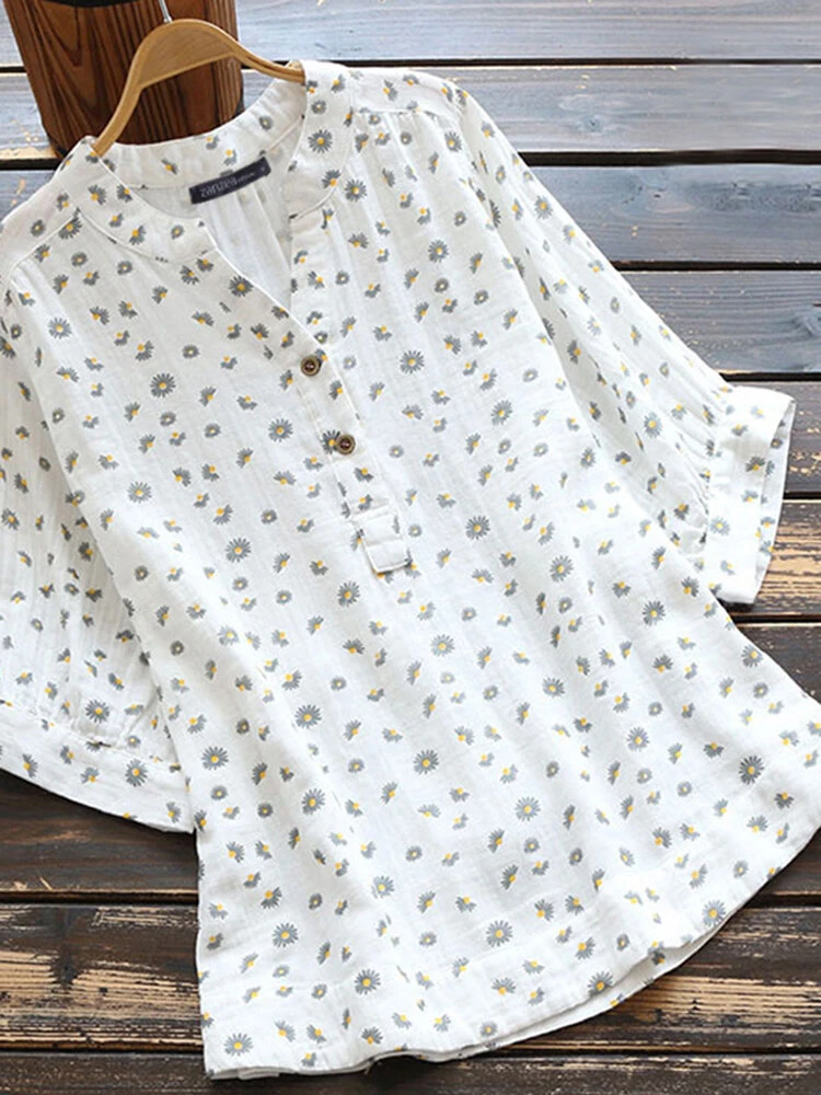 Color: White, Blue, Yellow Material: Cotton, Linen Pattern: Floral Print Style: Casual Sleeves Length: Short Sleeve Collar: Stand Collar Season: Summer Package Included:1*Blouse