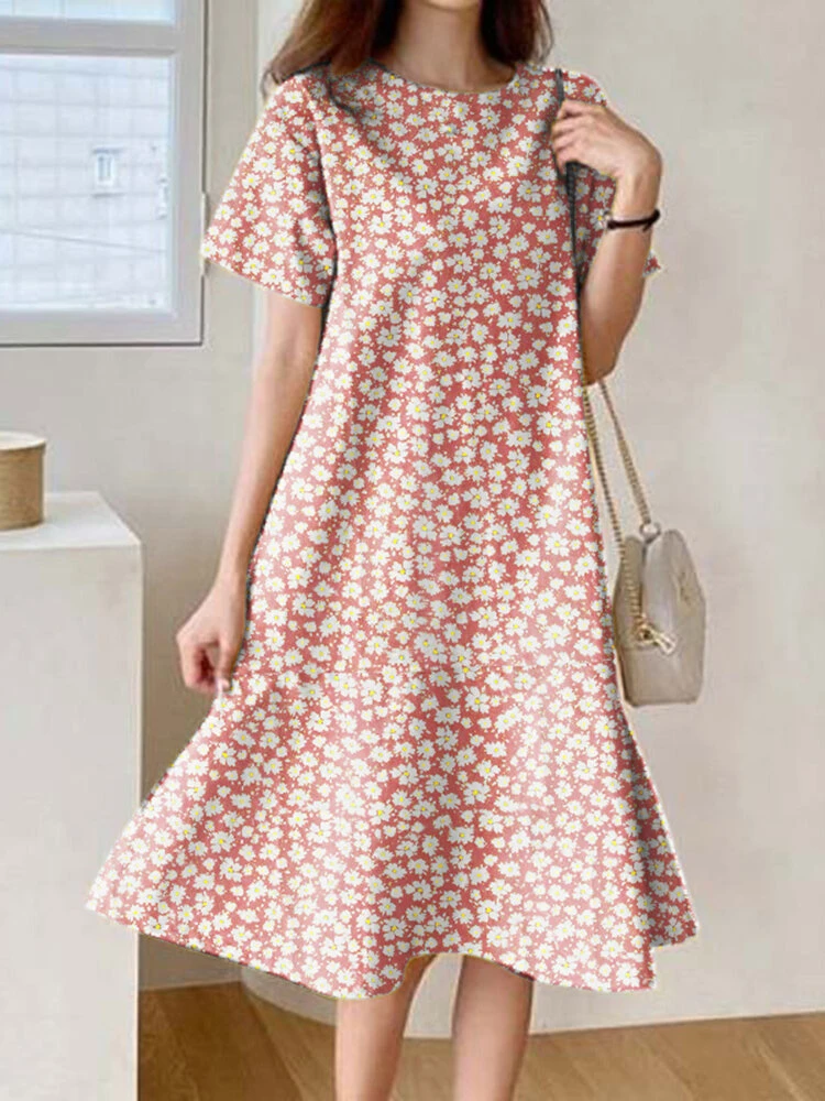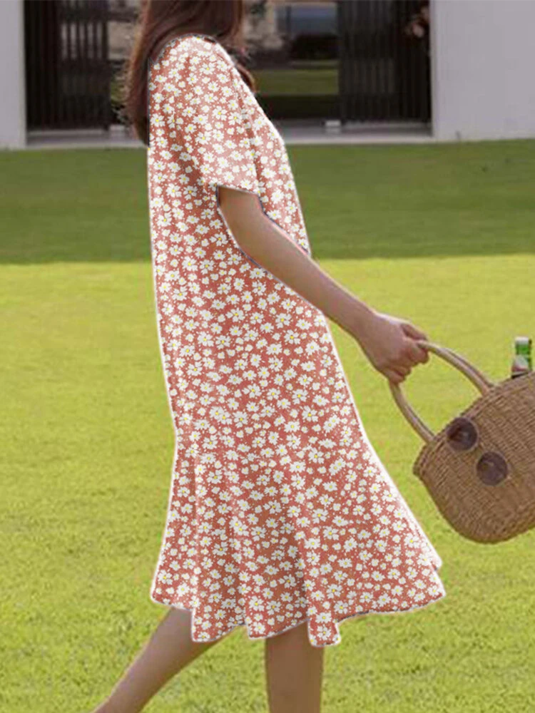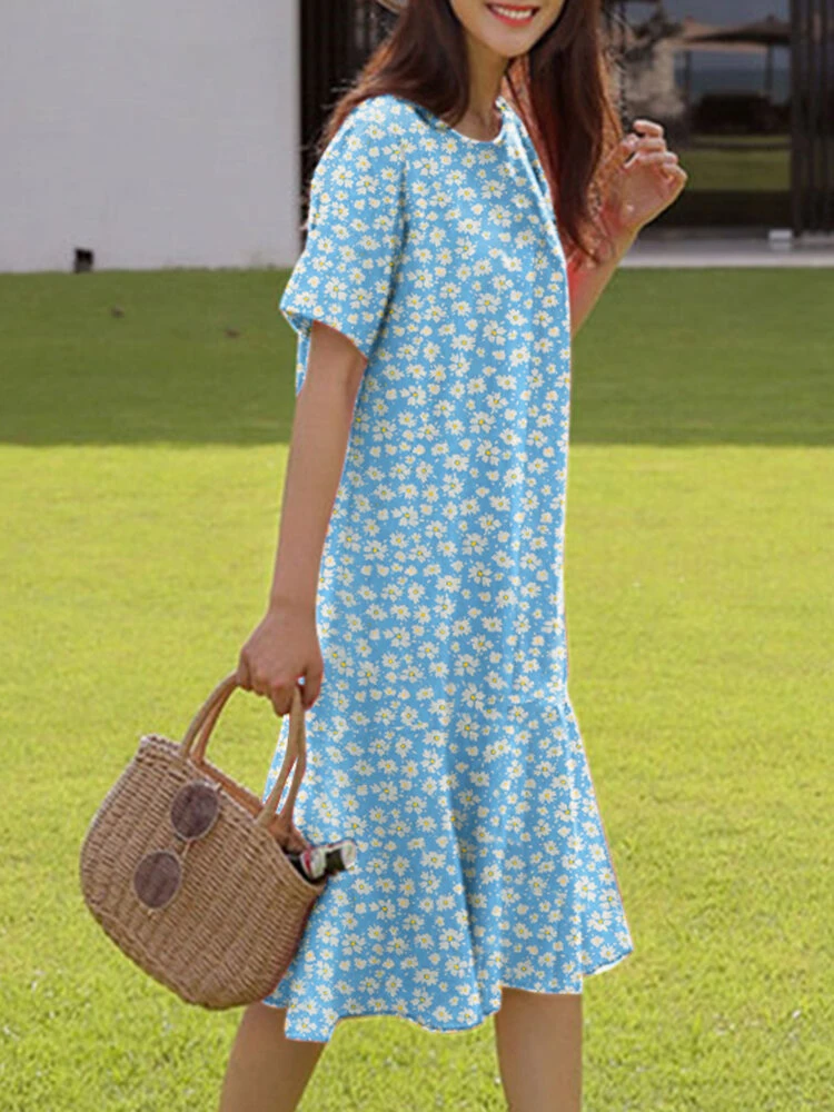 Allover Floral Print Ruffle Hem Short Sleeve Crew Neck Dress