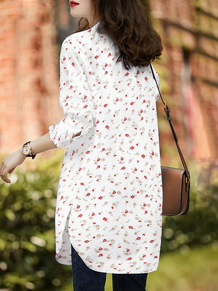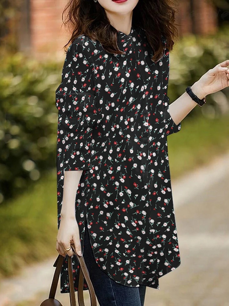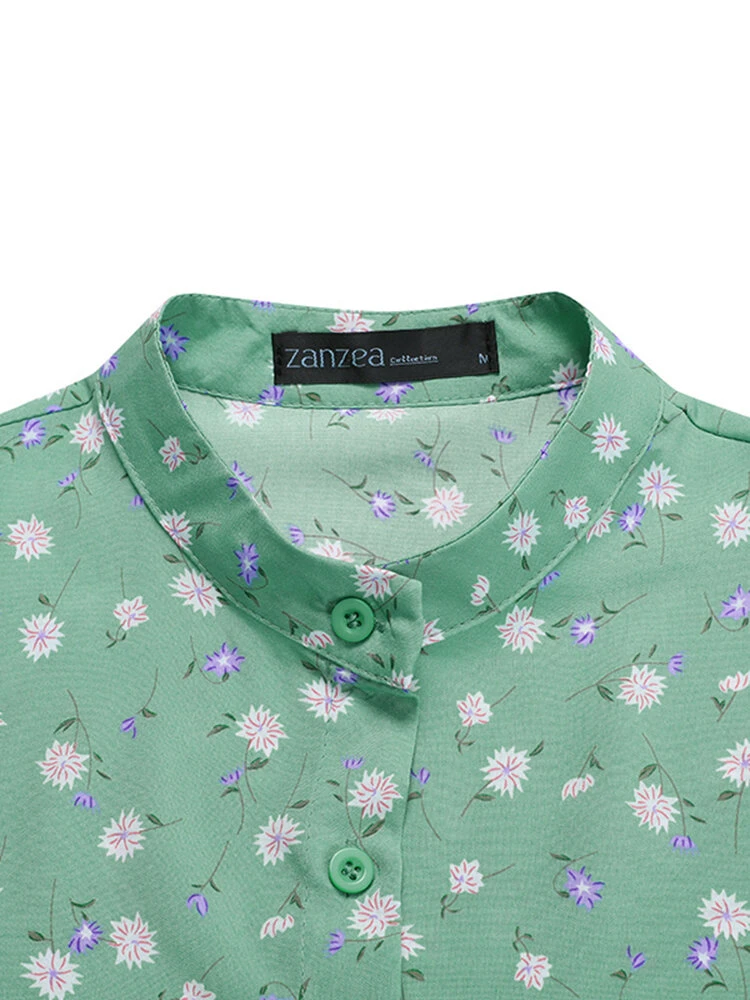 Allover Floral Print Stand Collar Long Sleeve Casual Blouse