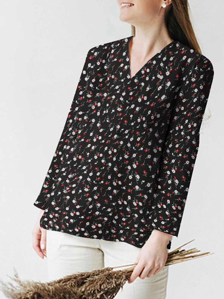 Allover Floral Print V-neck Slit Hem Long Sleeve Blouse