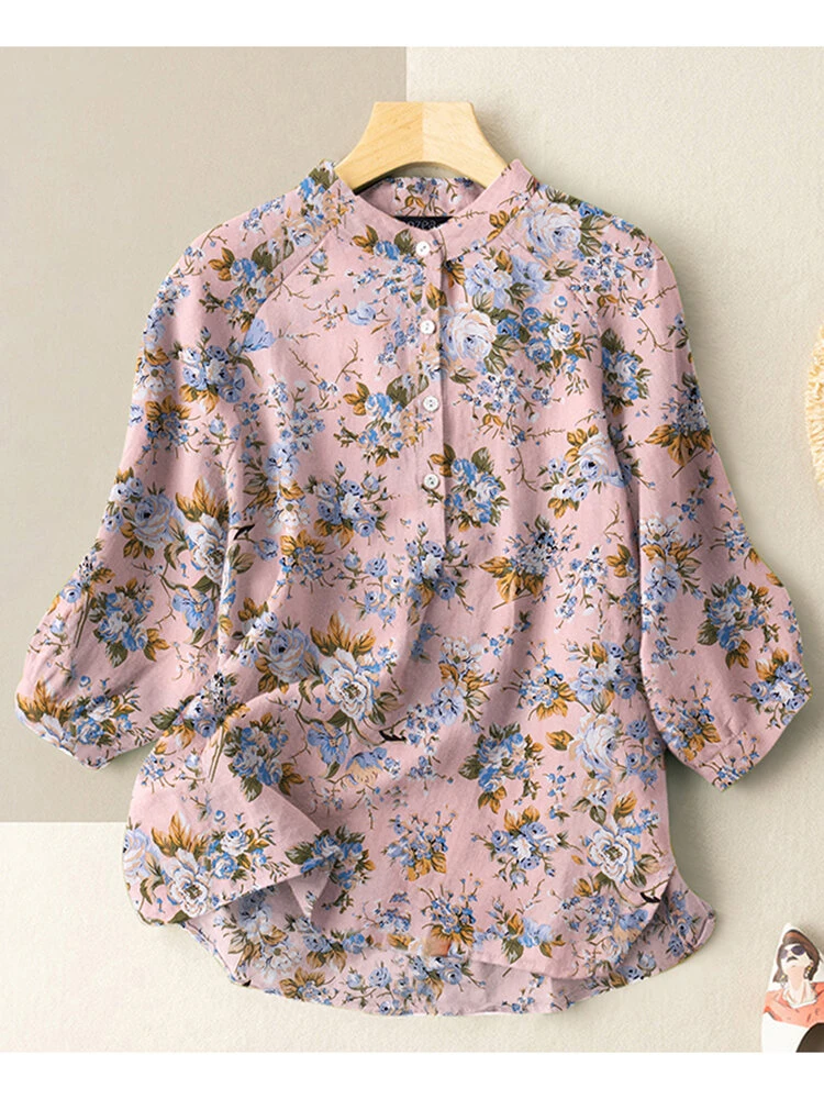 Color: White, Pink, Black Material: Polyester Pattern: Calico Occasion: Everyday Style: Casual Sleeves Length: 3/4 Length Sleeve Collar: Stand Collar Season: Autumn, Spring Design Element: Button Front Package Included:1*Blouse