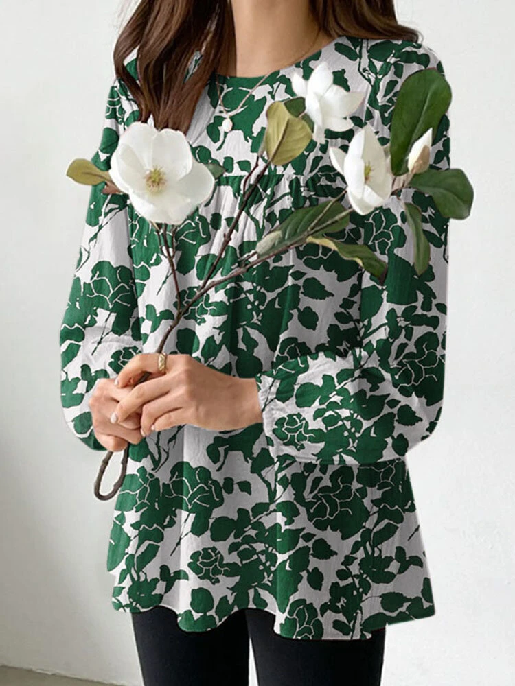 Allover Plants Print Crew Neck Long Sleeve Casual Blouse