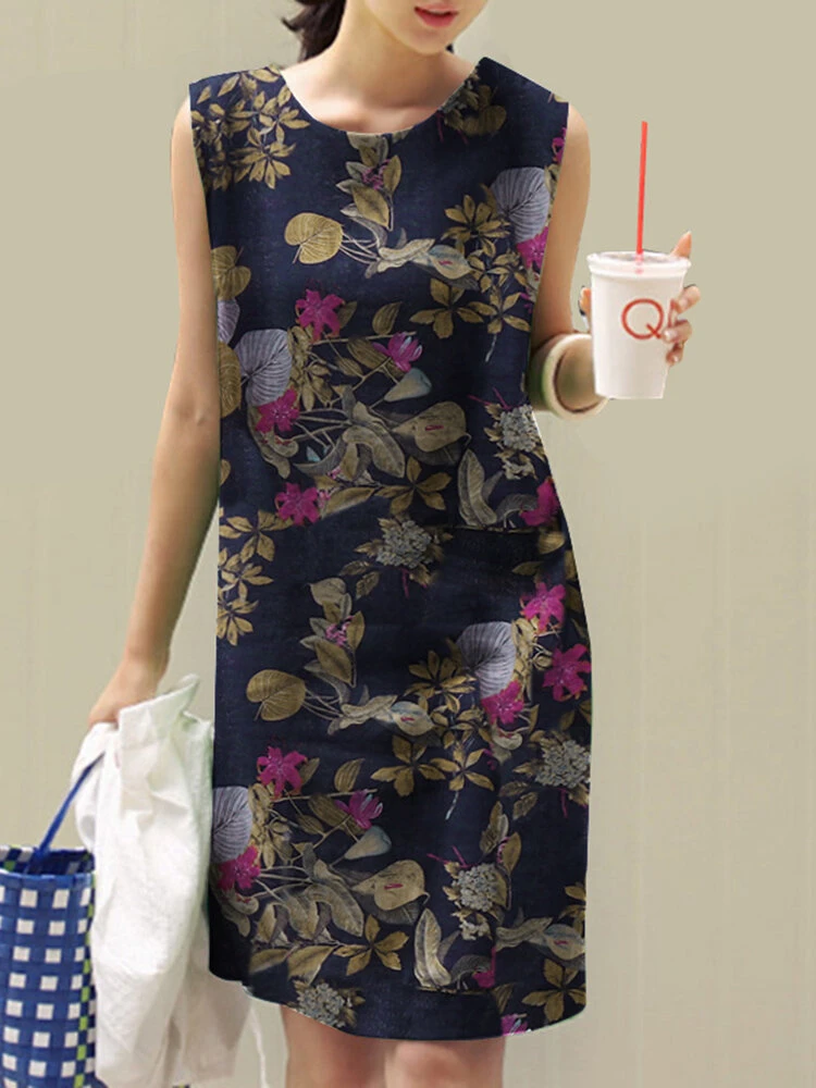 Allover Plants Print Sleeveless Crew Neck Vintage Dress