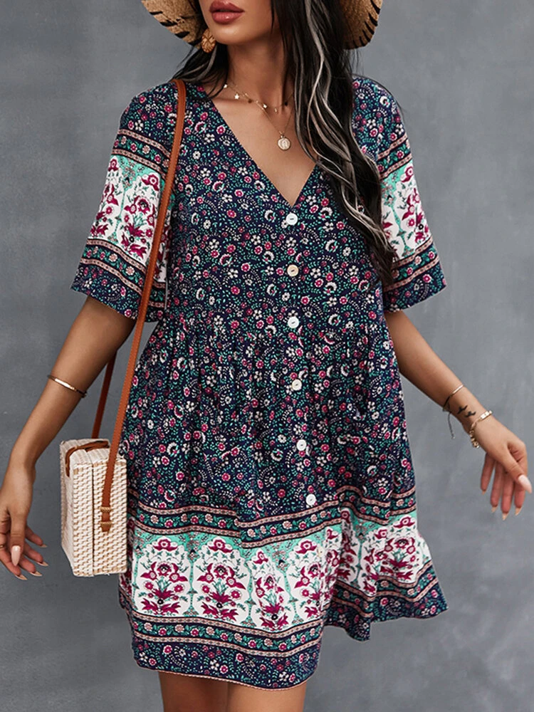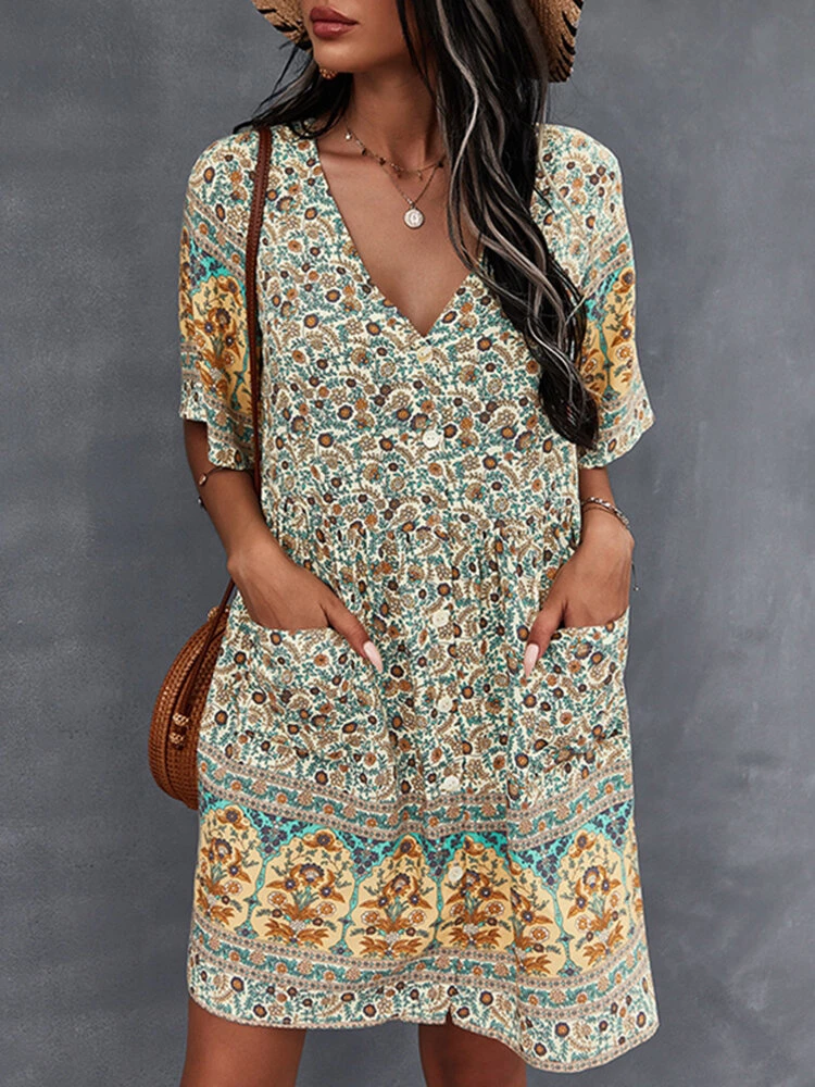 Bohemian Floral Print Pocket Button V-neck Short Sleeve Dress