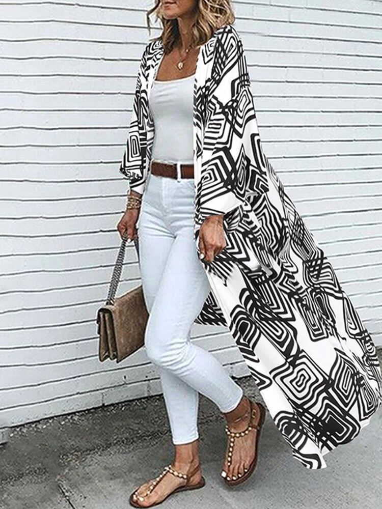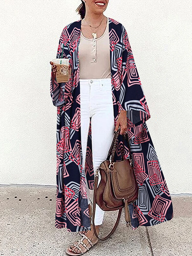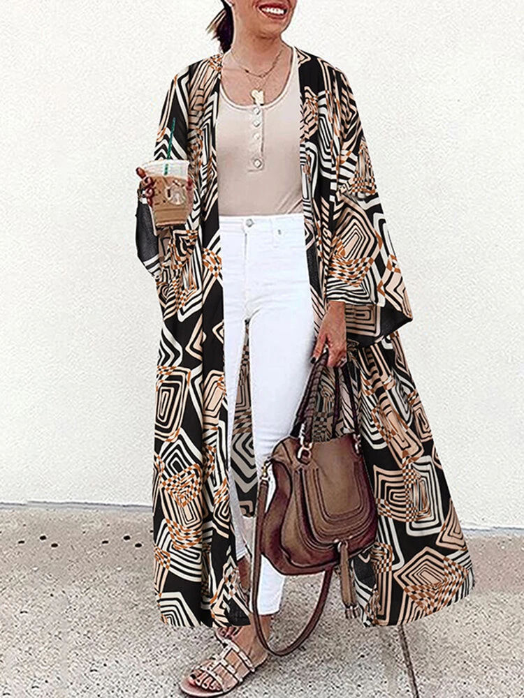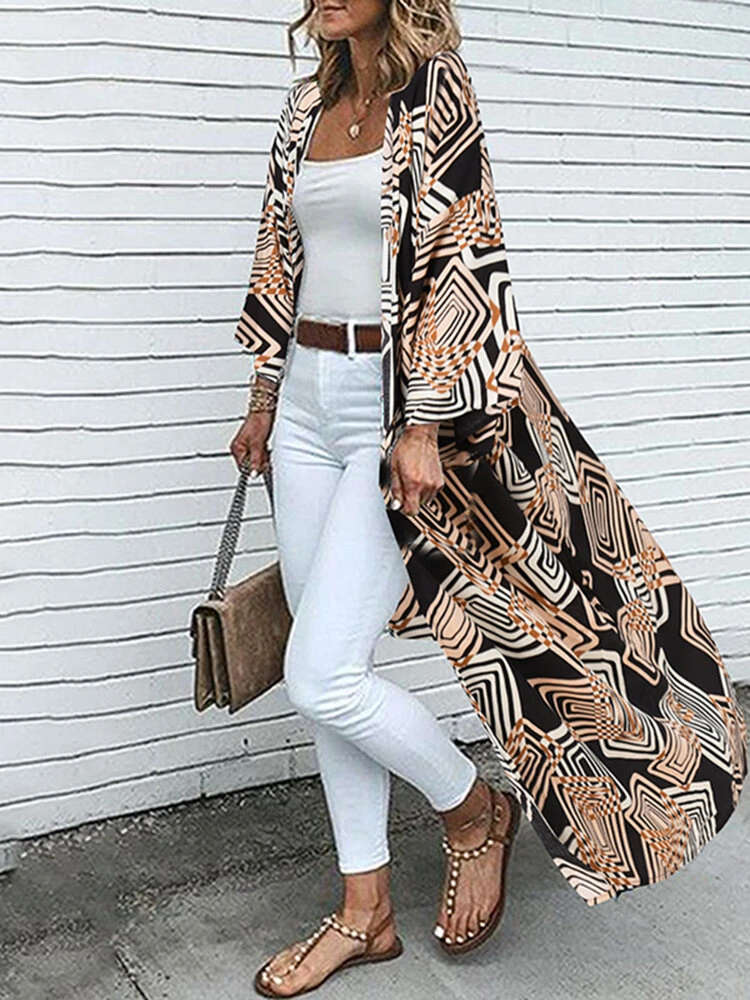 Bohemian Geo Print Loose Long Sleeve Open Front Kimono
