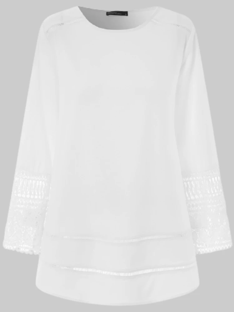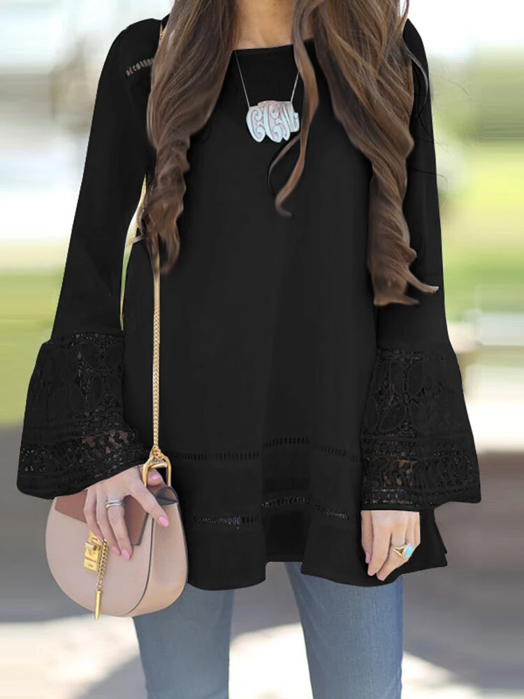 Casual Solid Color Lace Bell Sleeve O-neck Plus Size Blouse For Women
