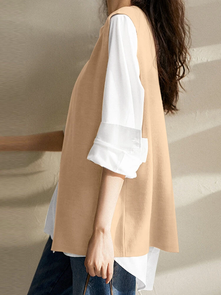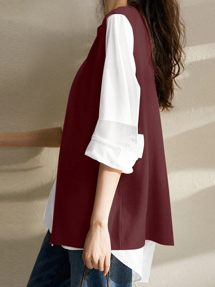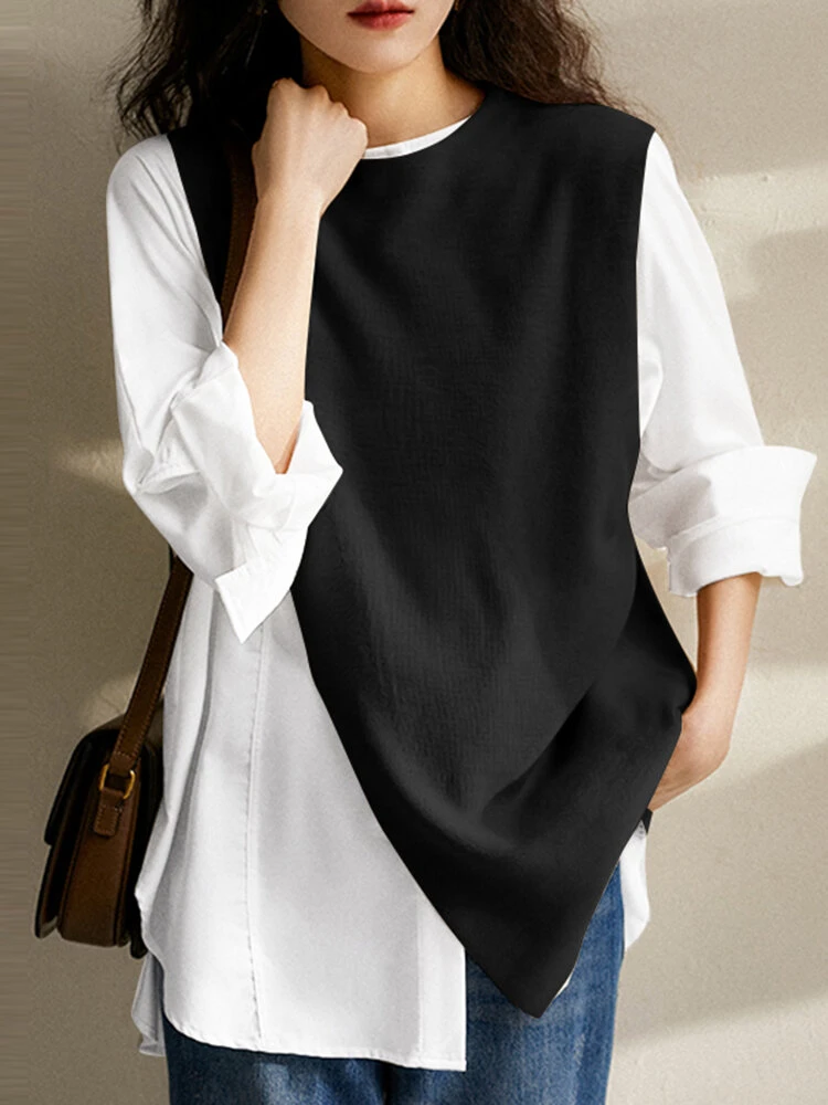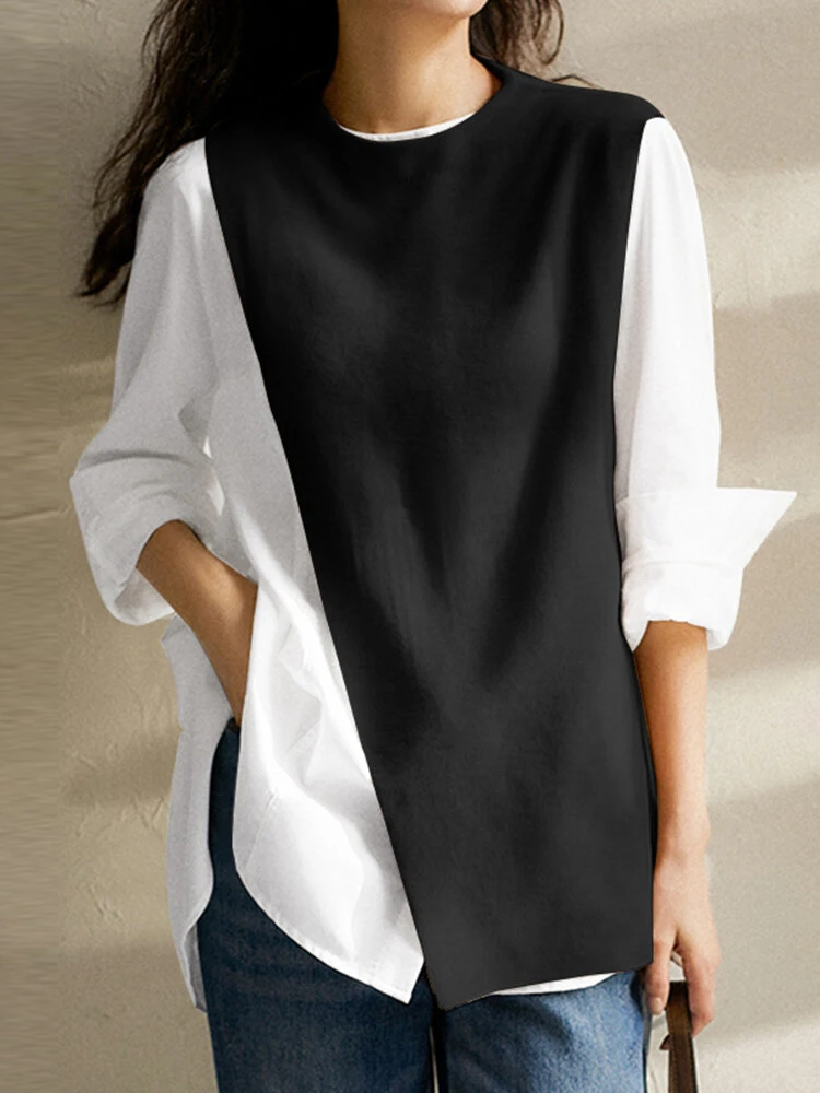 Contrast Patchwork Long Sleeve Crew Neck Casual Blouse