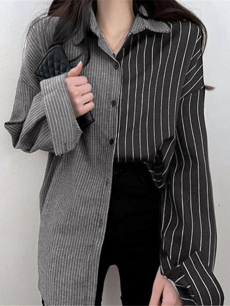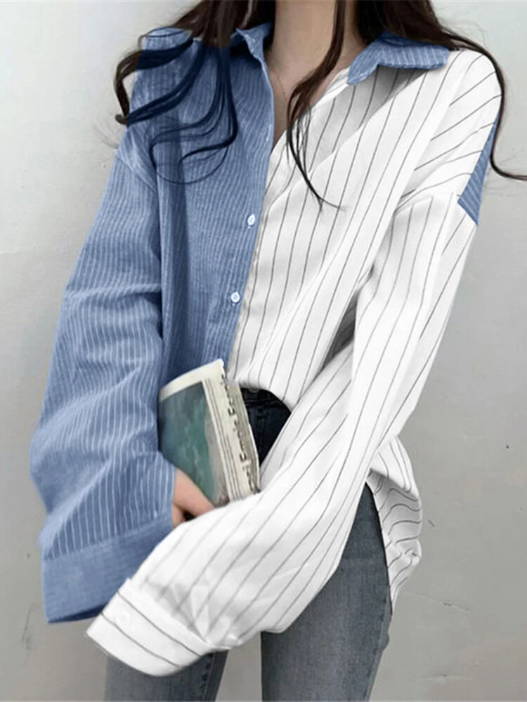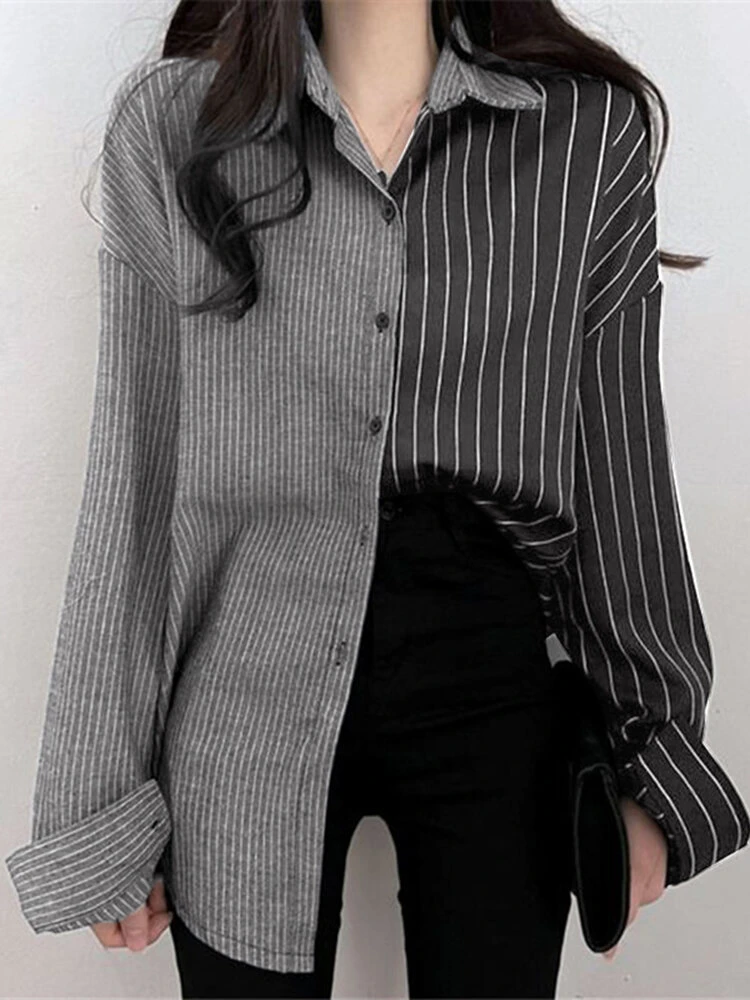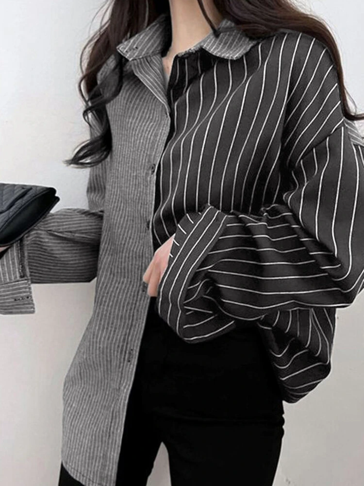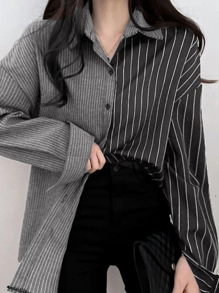 Color: White, Black Material: Polyester Pattern: Striped Occasion: Everyday Style: Casual Sleeves Length: Long Sleeve Collar: Lapel Collar Season: Autumn, Spring Design Element: Button Front Package Included:1*Shirt