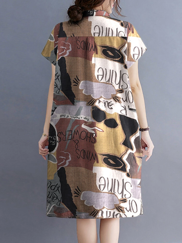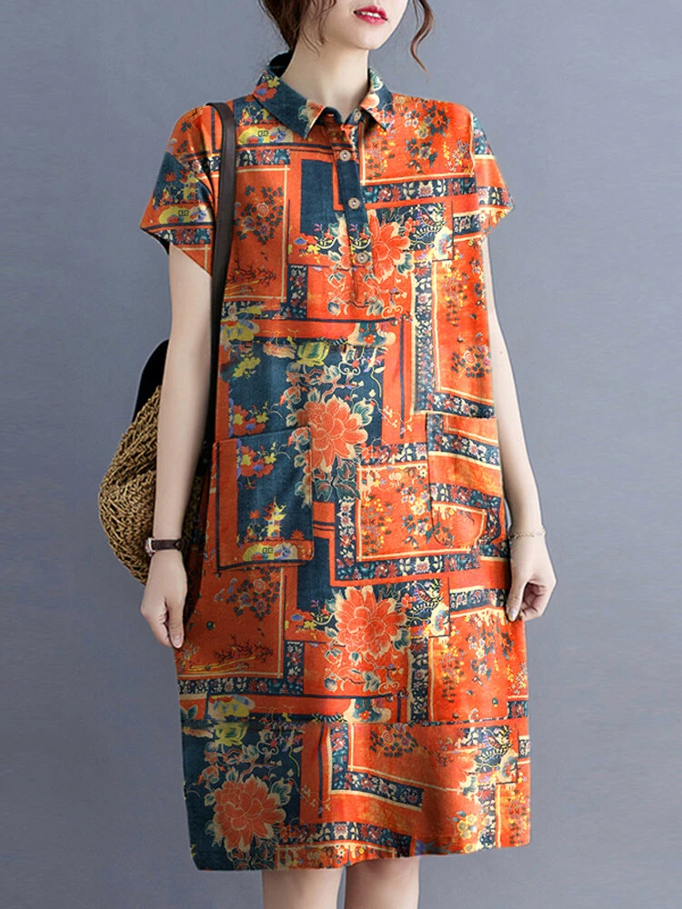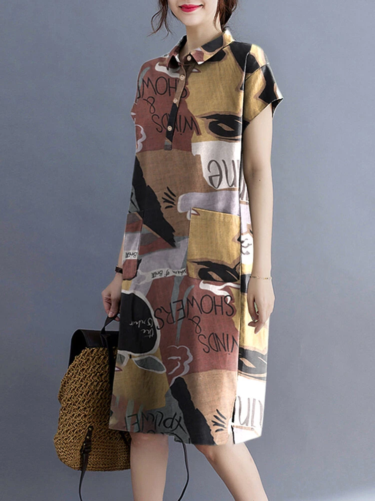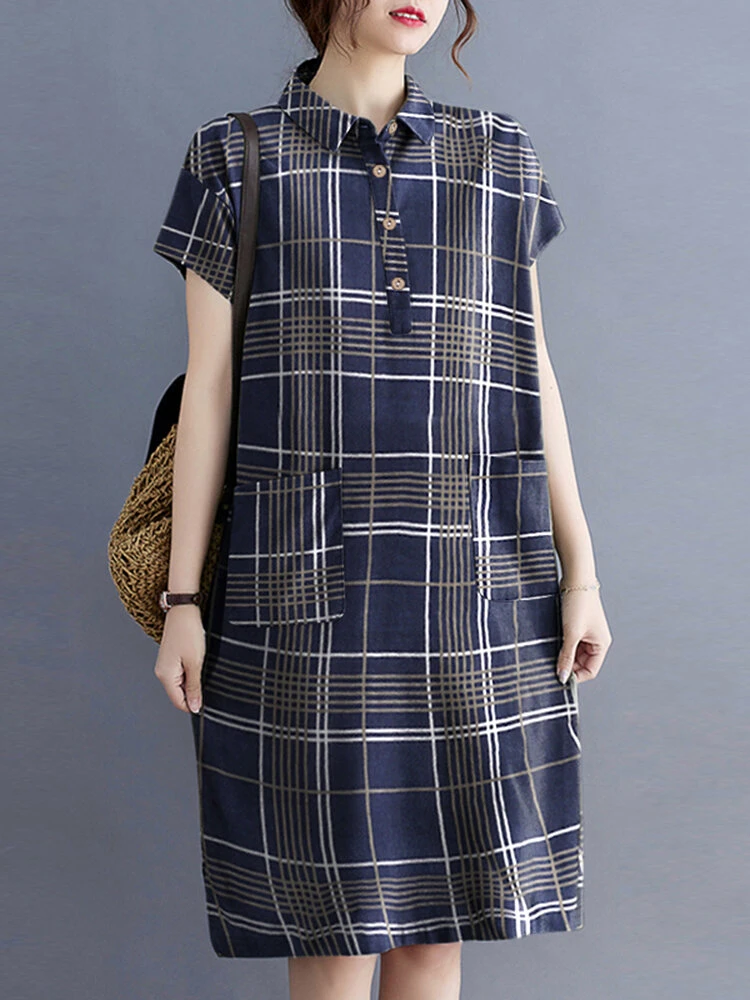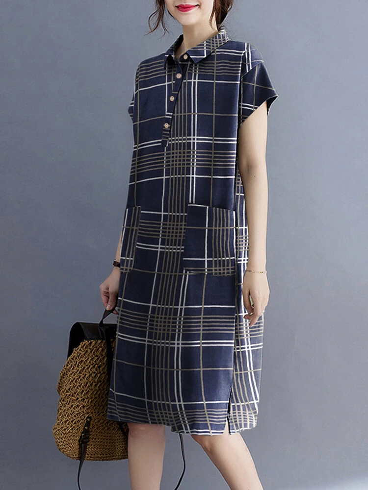 Color: Navy, Orange, Brown Style: Vintage, Casual Occasion: Everyday Material: Cotton Pattern: Letter Print, Plaid Design Element: Pocket, Button Front Season: Summer Collar: Lapel Collar Sleeves Length: Short Sleeve Length: Midi Fit Type: Regular Package included:1*Dress