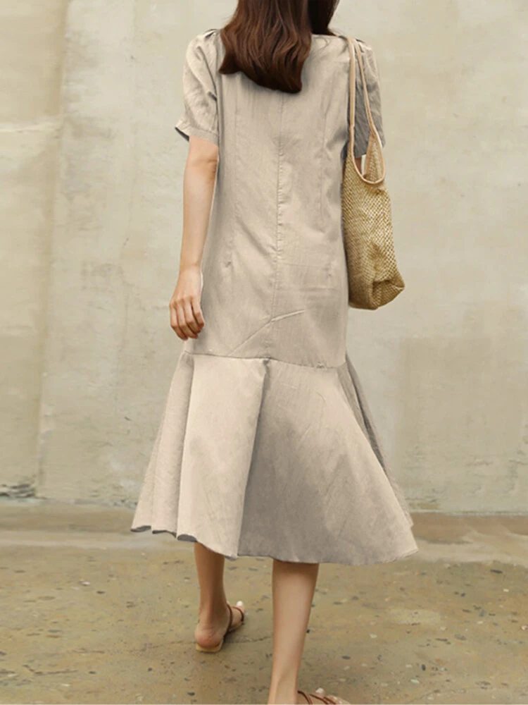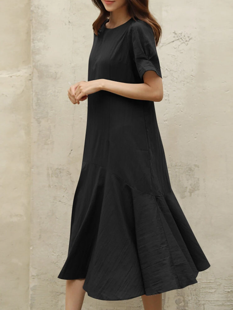 Cotton Solid Ruffle Short Sleeve Round Neck Casual Midi Dress