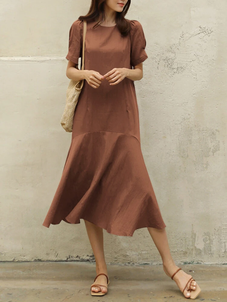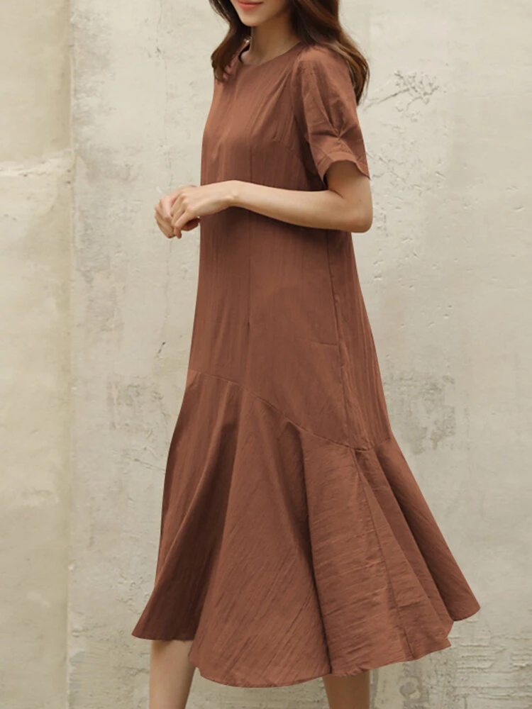 Color: Khaki, Black, Brown Style: Casual Occasion: Everyday Material: Cotton Pattern: Plain Season: Summer Collar: Crew Neck Hem Design: Ruffle hem Sleeves Length: Short Sleeve Length: Midi Fit Type: Regular Package included:1*Dress