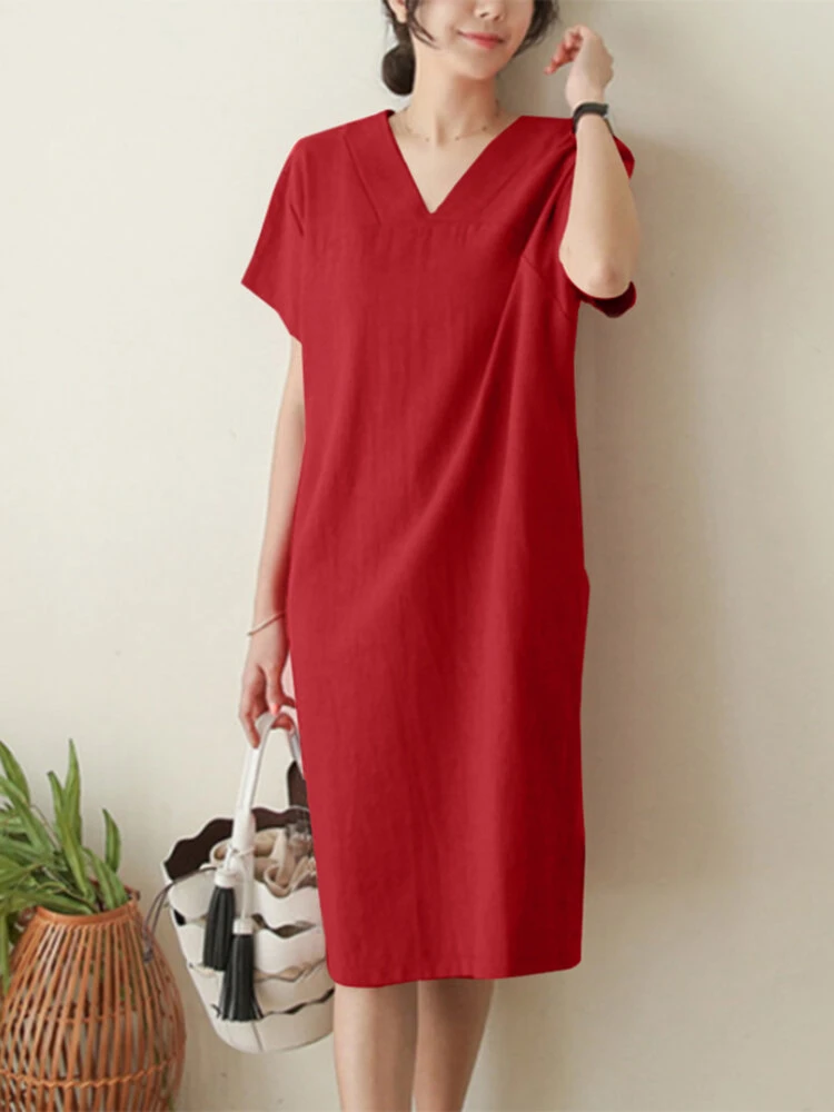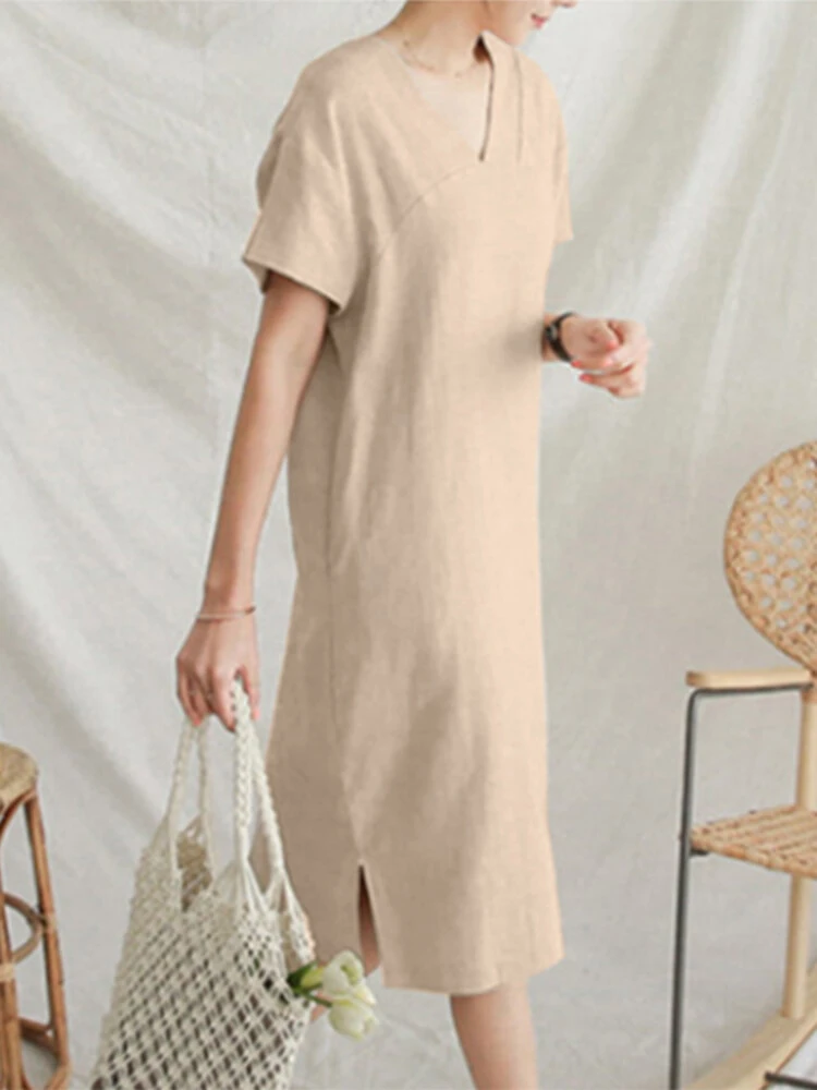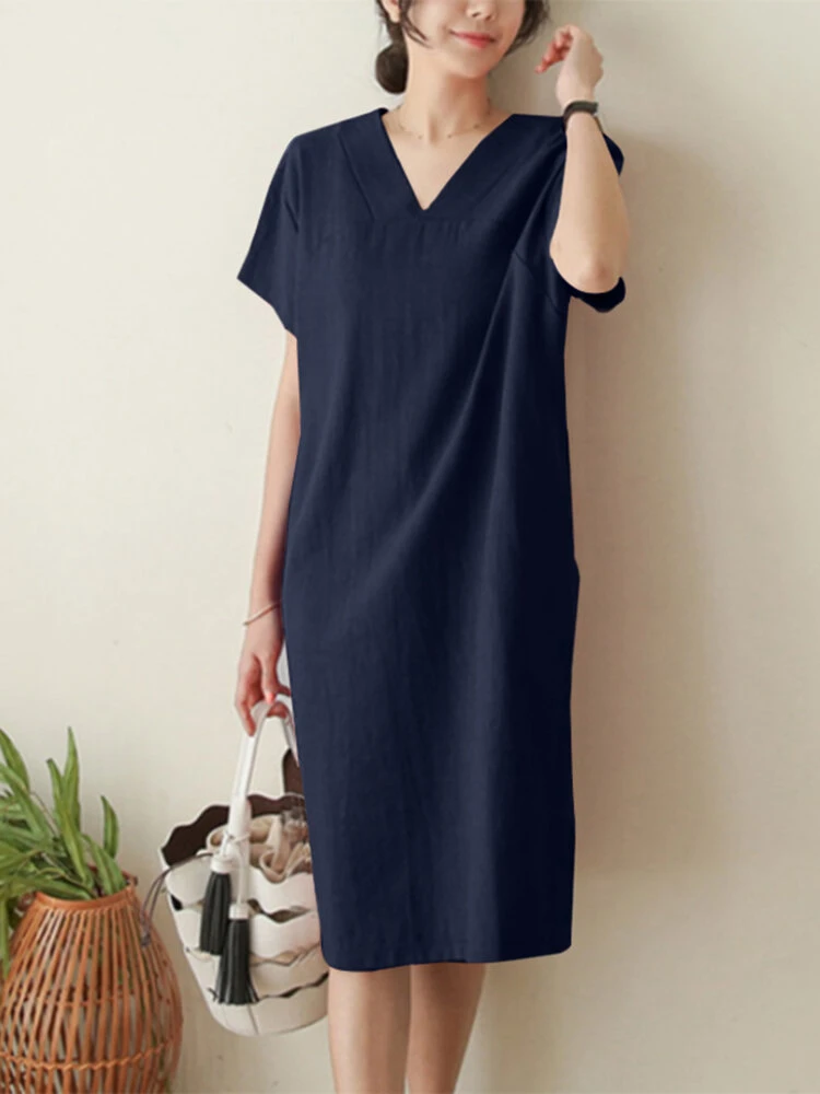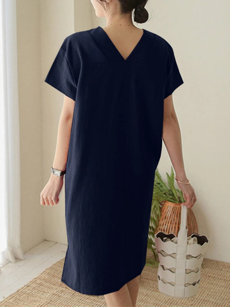 Cotton Solid Short Sleeve V Neck Casual Midi Dress