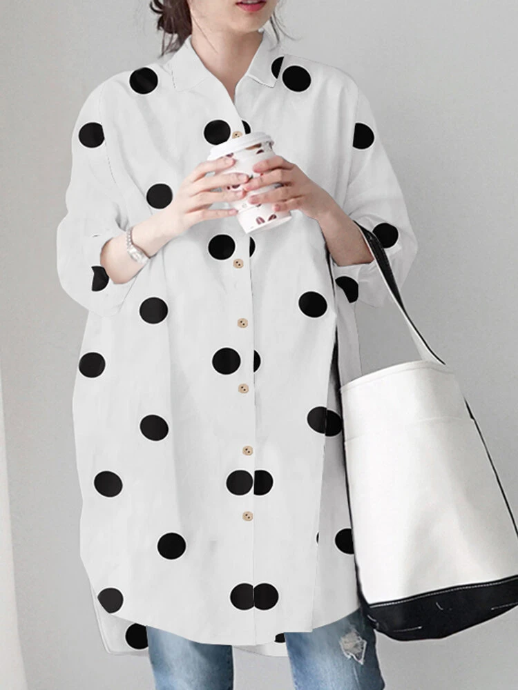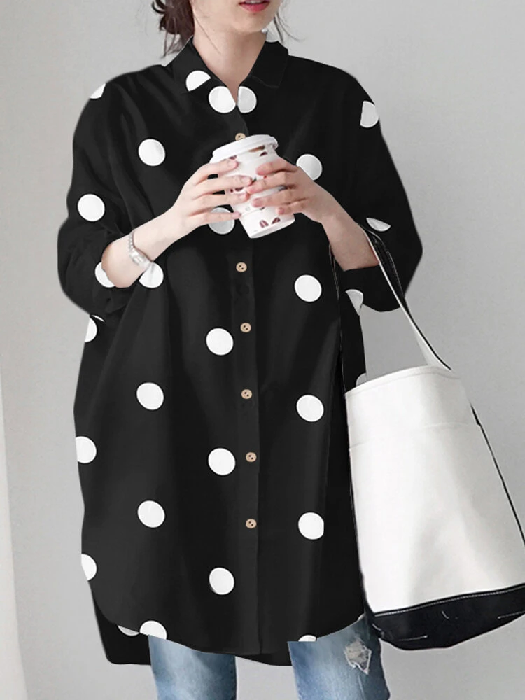 Dot Print Loose Lapel Long Sleeve Button Down Shirt
