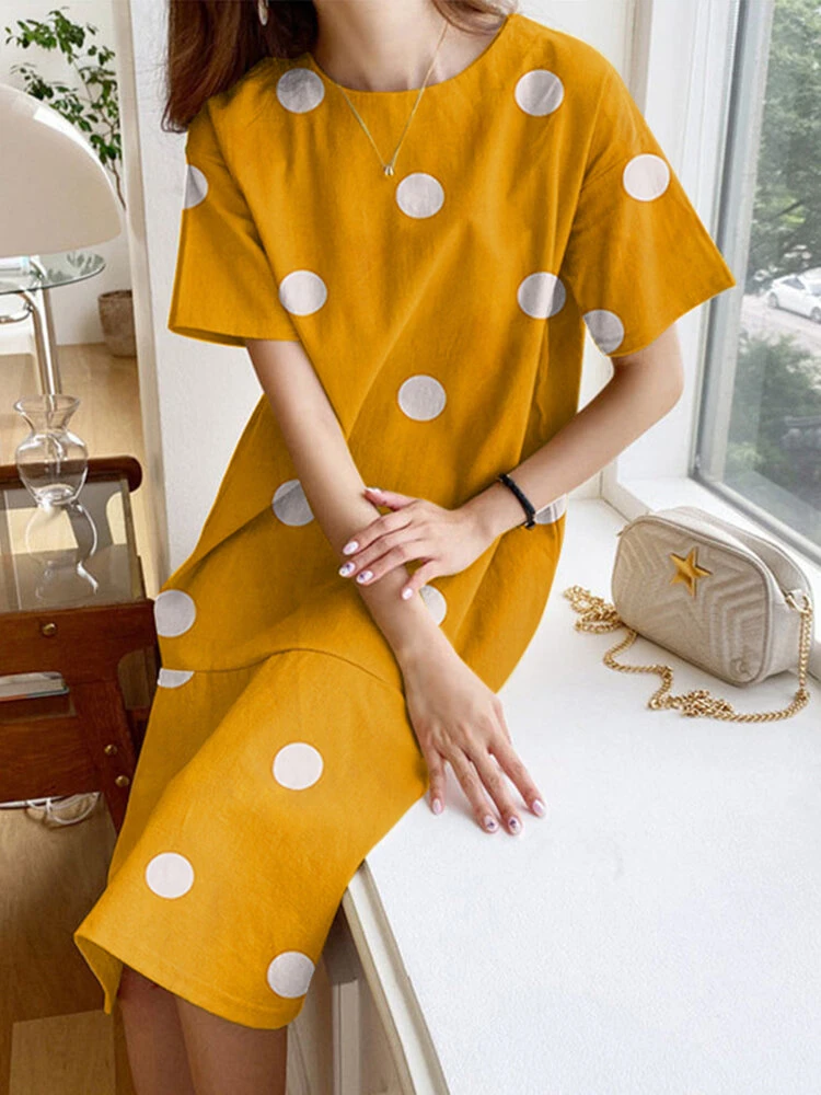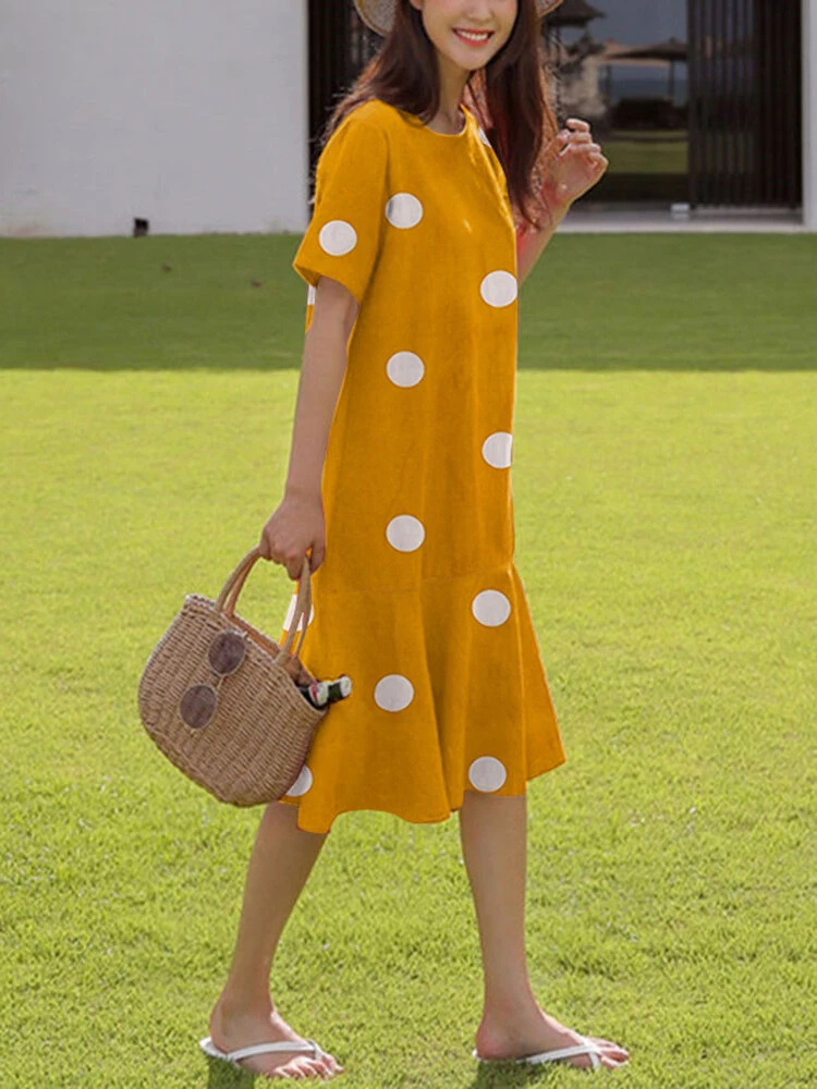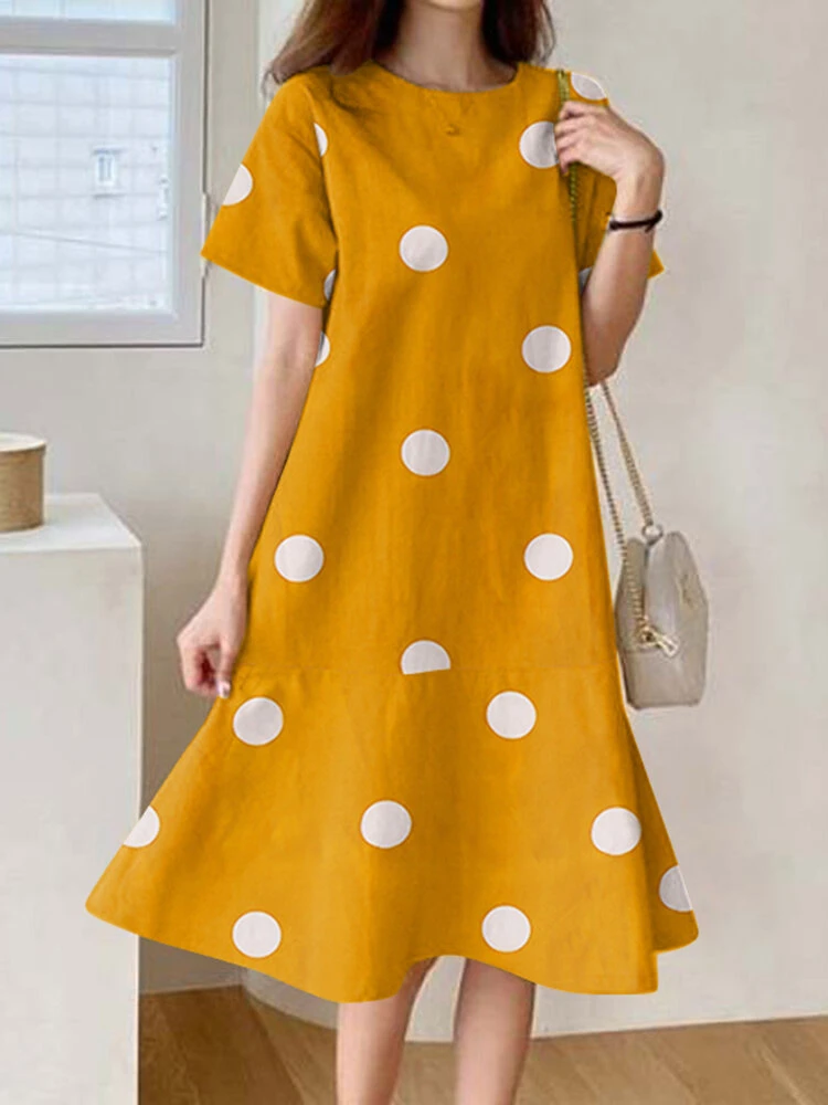 Color: Black, Yellow, Pink Style: Casual Occasion: Everyday Material: Polyester Pattern: Polka Dot Season: Summer Collar: Crew Neck Hem Design: Ruffle hem Sleeves Length: Short Sleeve Package Included:1*Dress