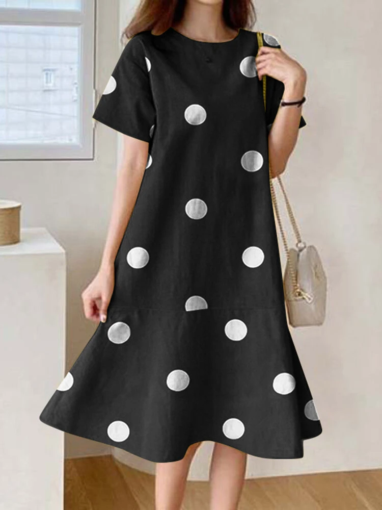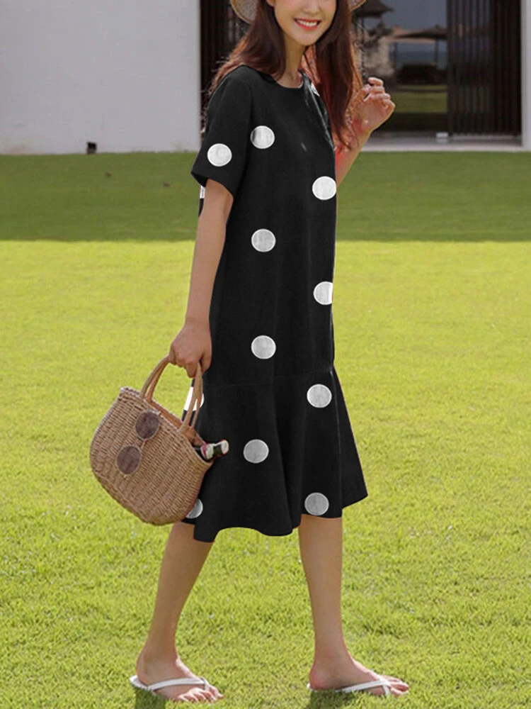 Dot Print Ruffle Hem Short Sleeve Crew Neck A-line Dress