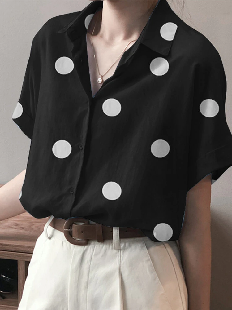 Color: White, Pink, Yellow, Black Material: Polyester Pattern: Polka Dot Occasion: Office chic Style: Casual Sleeves Length: Short Sleeve Collar: Lapel Collar Fit Type: Loose Season: Summer Design Element: Button Front Hem Design: Slit Hem Package Included:1*Shirt