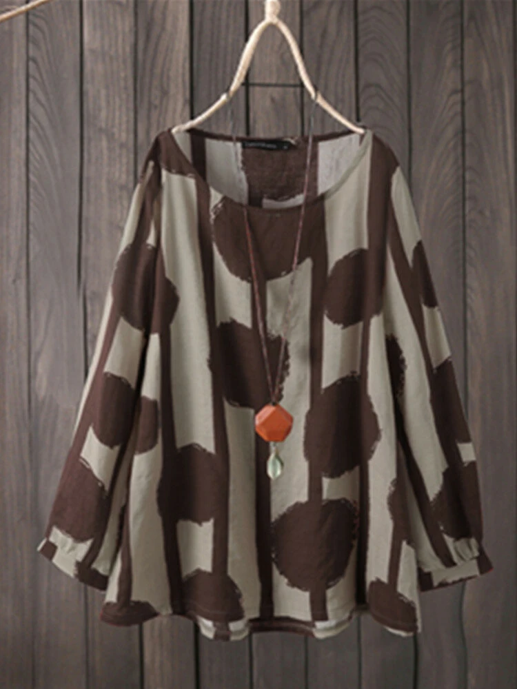 Dot Striped Print O-neck Long Sleeve Plus Size Blouse For Women