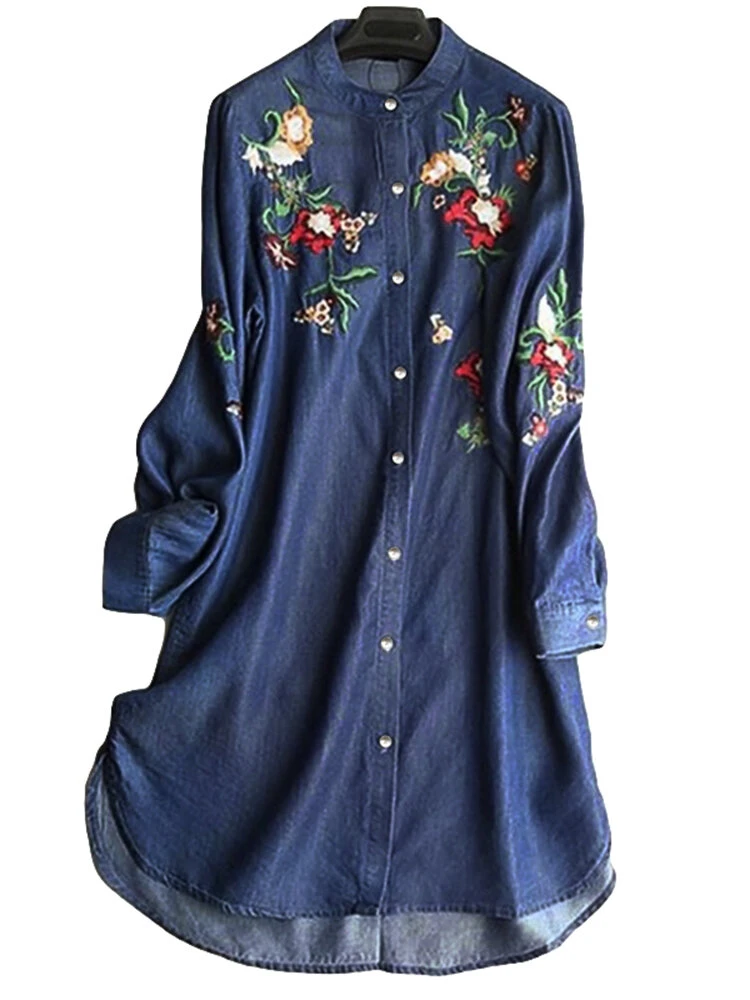 Embroidered Stand Collar Irregular Long Sleeve Vintage Blouse