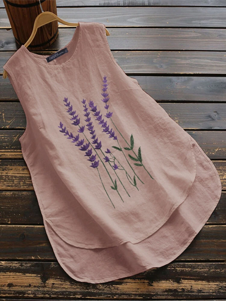 Embroidery Lavenders O-neck Asymmetrical Plus Size Tank Top
