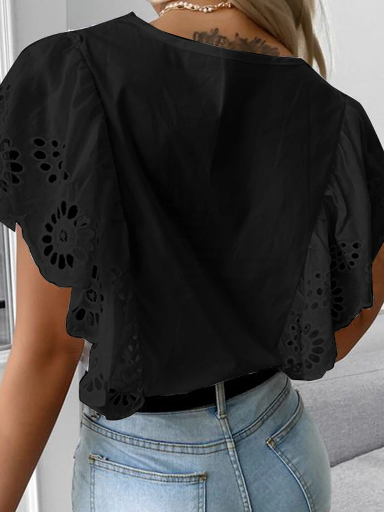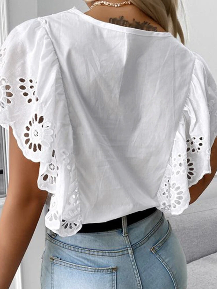 Eyelet Ruffle Sleeve Lace V-neck Blouse For Women