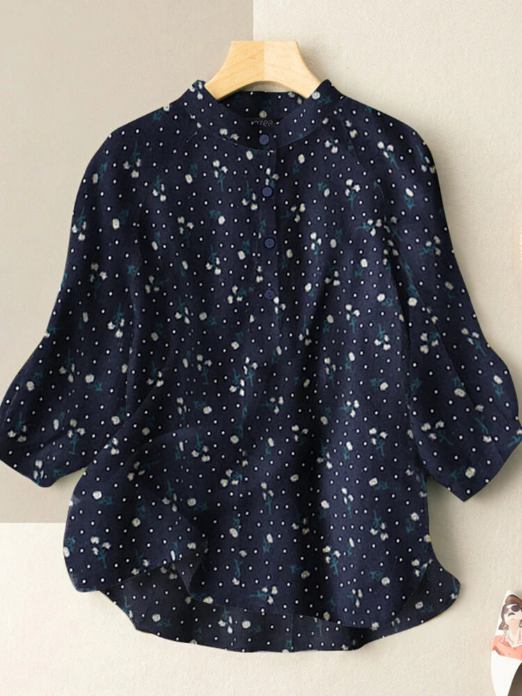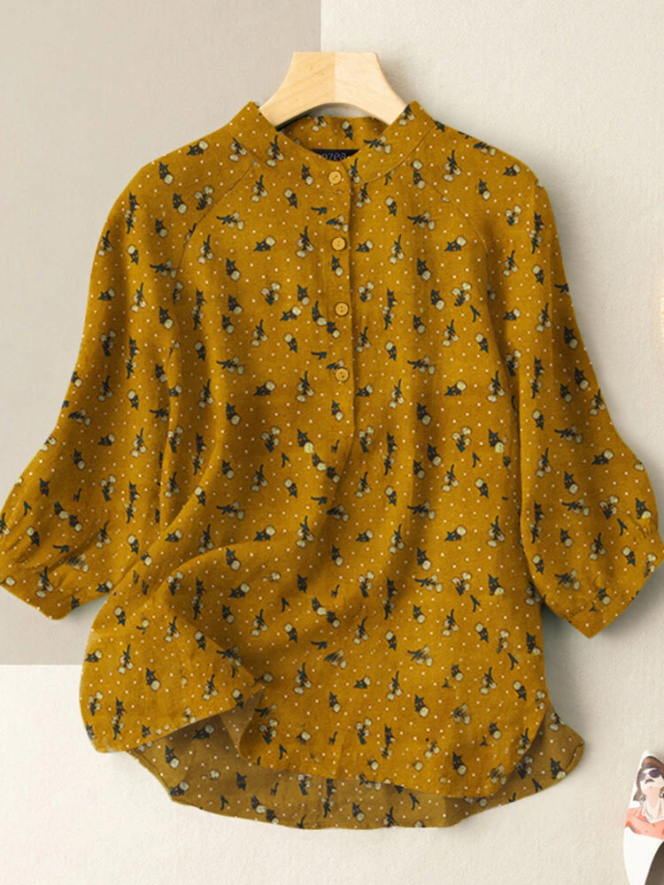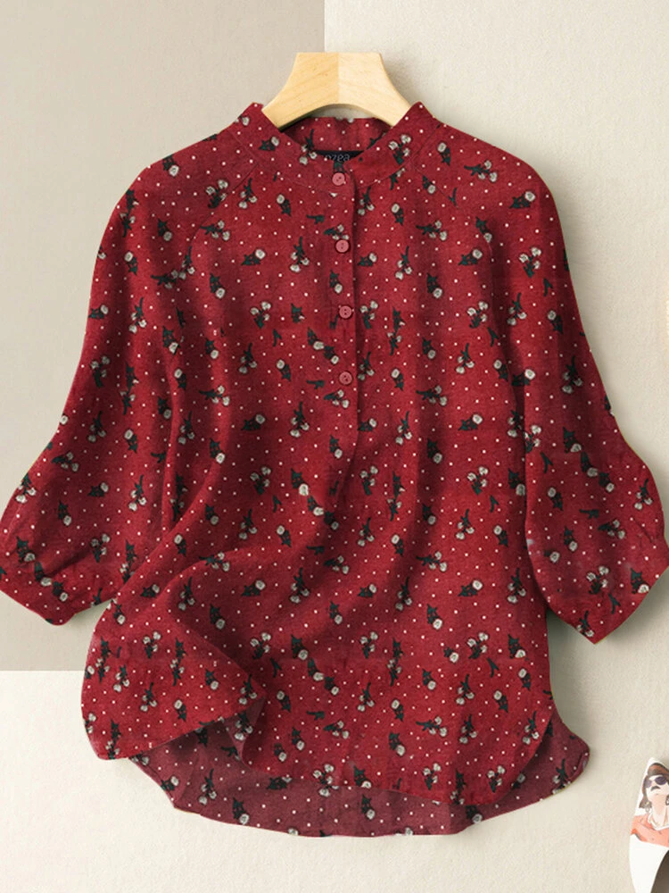 Color: Red, Navy, Yellow Material: Cotton Pattern: Floral Print Occasion: Casual Style: Casual Sleeves Length: 3/4 Length Sleeve Collar: Stand Collar Season: Autumn, Spring Design Element: Print, Button Thickness: Moderate Package included:1*Blouse