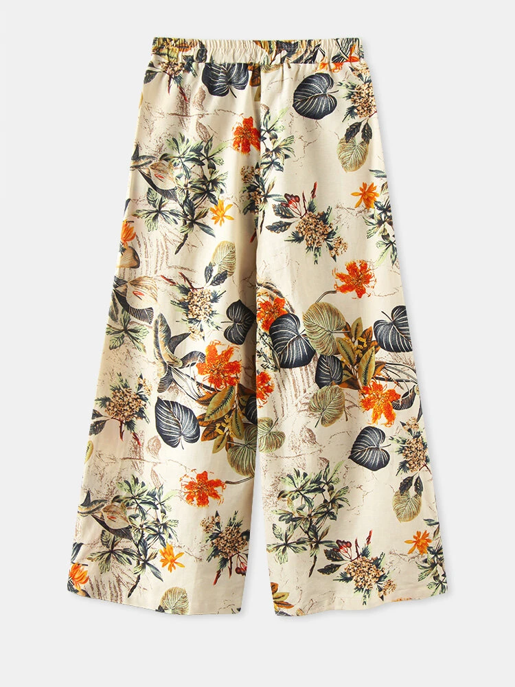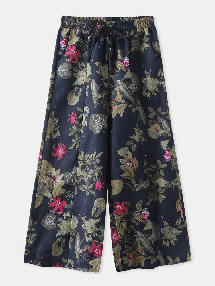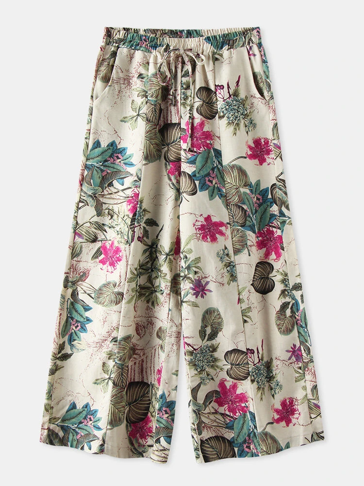 Floral Print Drawstring Wide Leg Plus Size Pants For Women