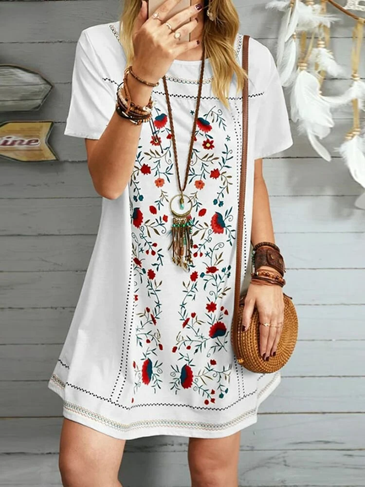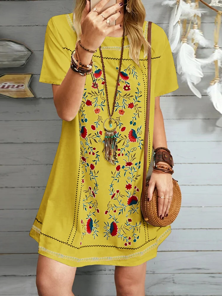 Color: White, Blue, Yellow Style: Casual Occasion: Vacation Material: Polyester Pattern: Floral Print Season: Summer Collar: Crew Neck Sleeves Length: Short Sleeve Package Included:1*Dress