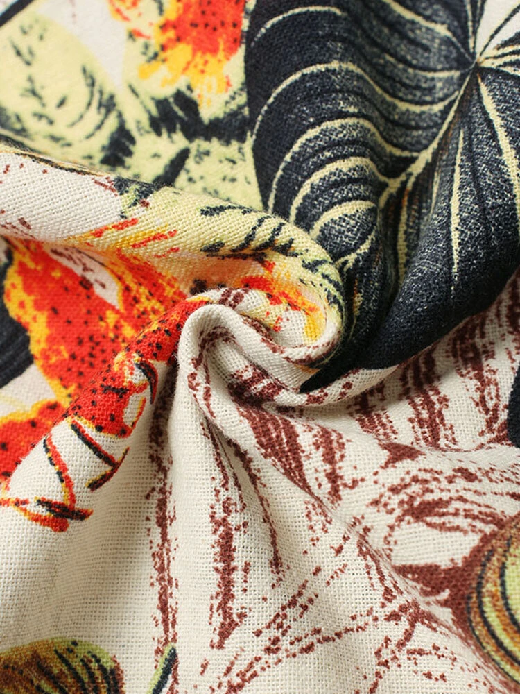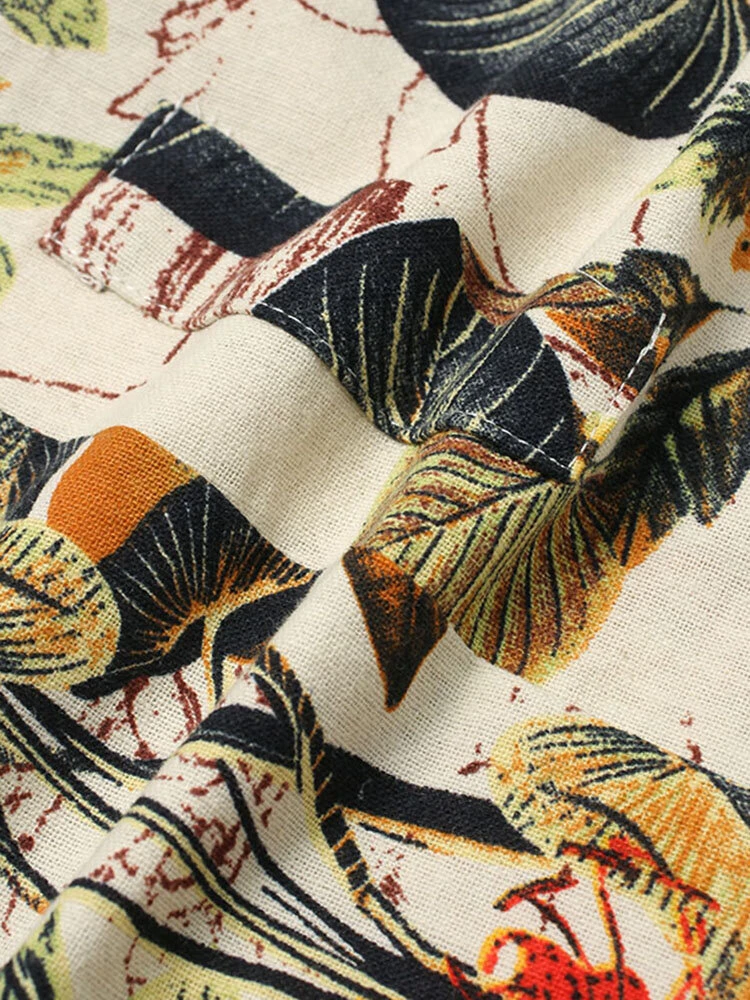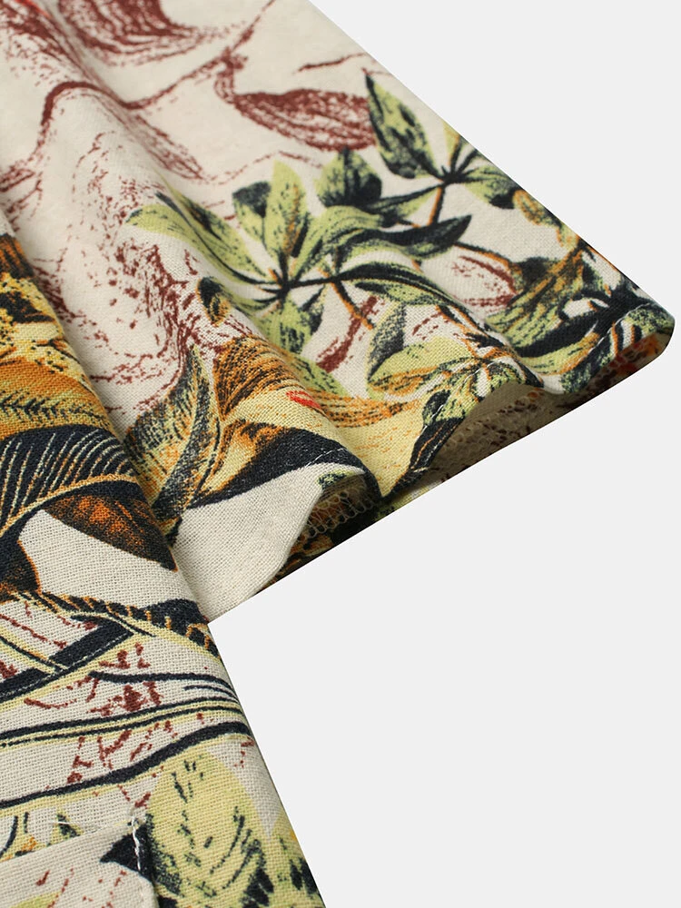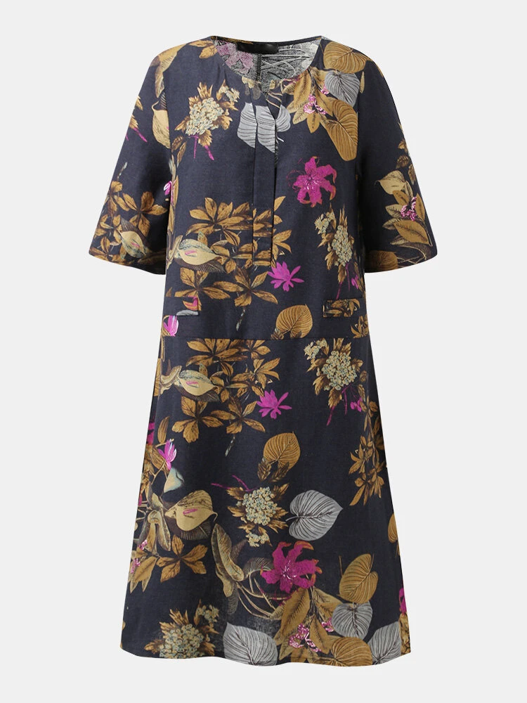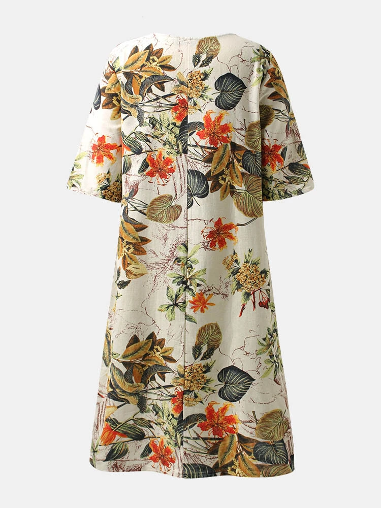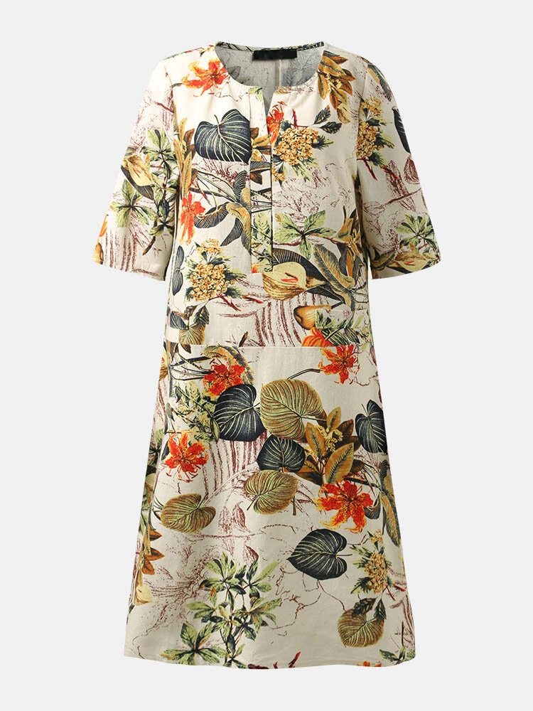 Floral Print Split O-neck Half Sleeve Casual Cotton Dress