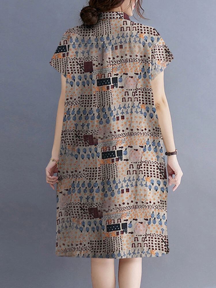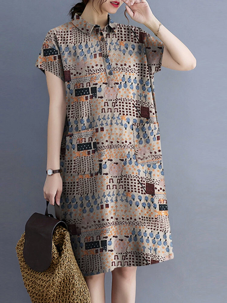 Color: Khaki, Blue, Orange, Green Style: Casual Occasion: Everyday Material: Polyester Pattern: Calico Design Element: Pocket, Button Front Season: Summer Collar: Lapel Collar Sleeves Length: Short Sleeve Length: Midi Fit Type: Regular Package included:1*Dress