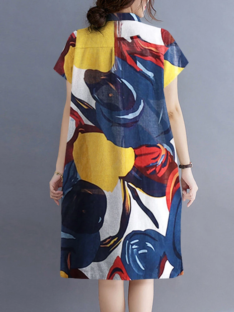 Flower Abstract Painted Print Button Pocket Lapel Midi Dress