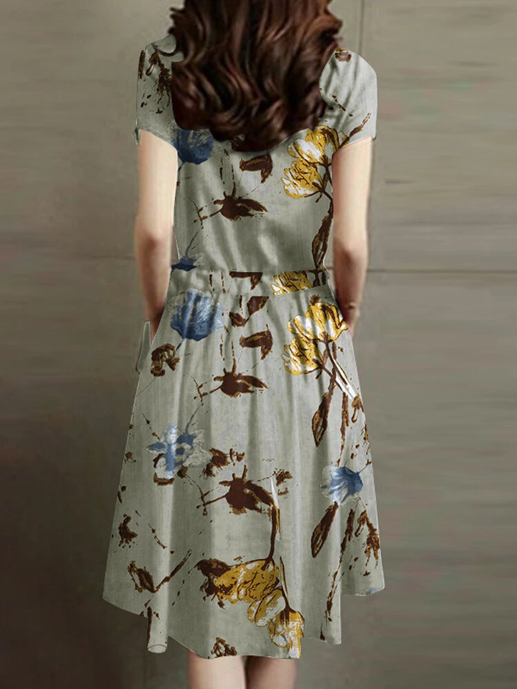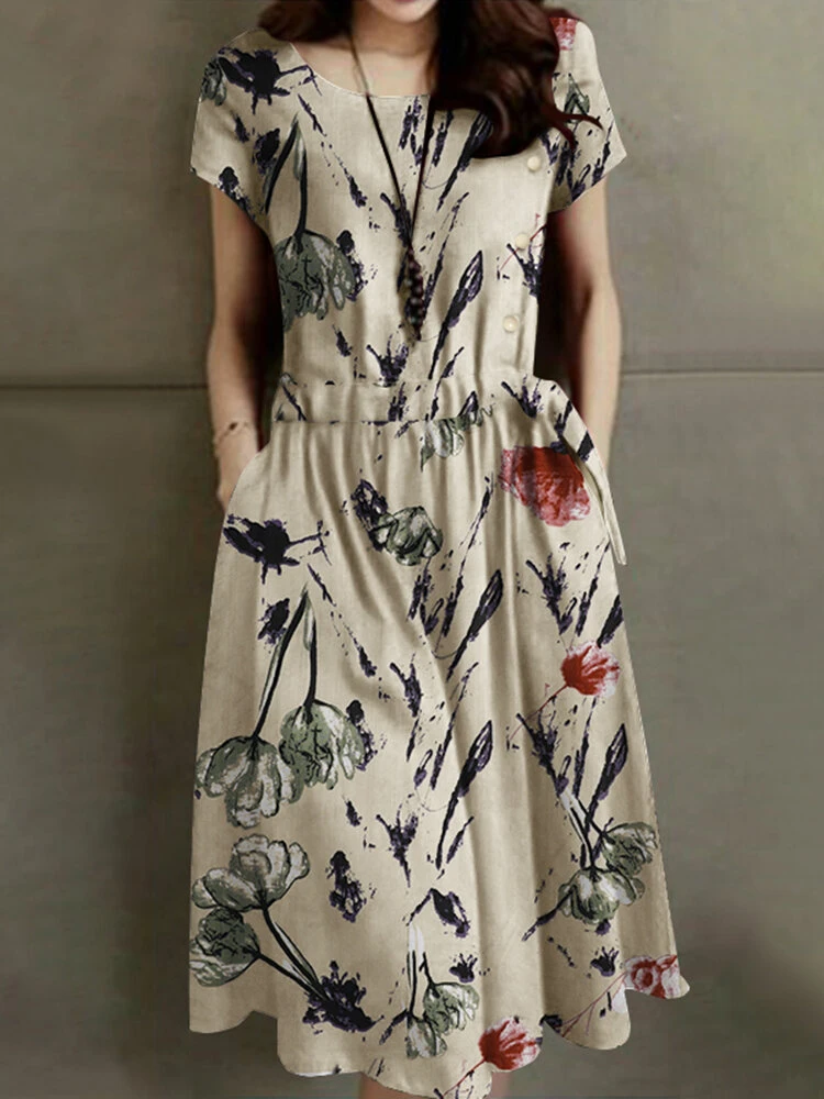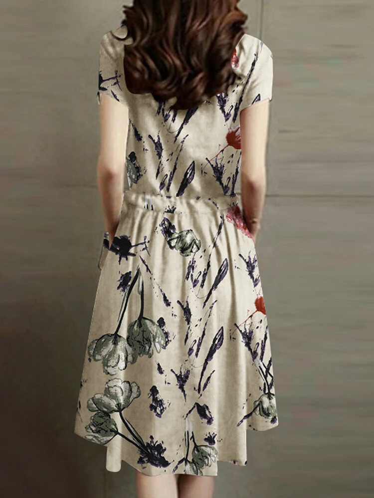 Flower Print Pocket Drawstring Short Sleeve Midi Dress
