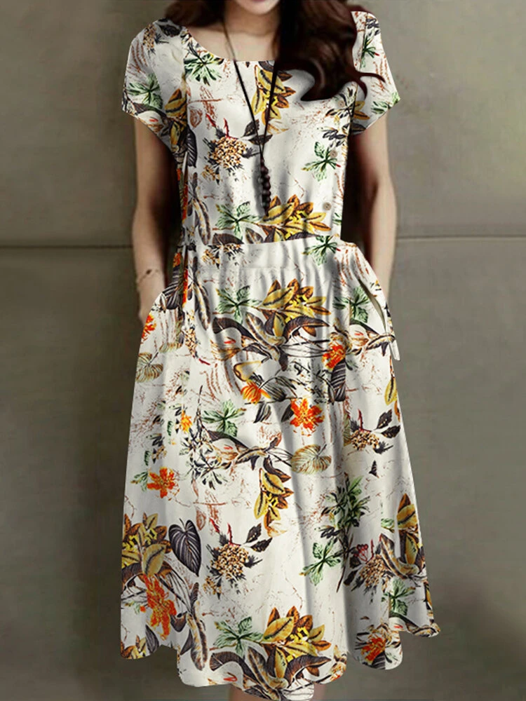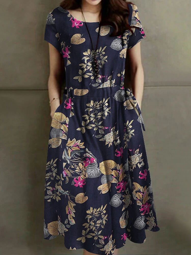 Color: Navy, Yellow, Rose Style: Casual Occasion: Everyday Material: Linen, Cotton Pattern: Calico Design Element: Pocket, Drawstring Season: Summer Collar: Crew Neck Sleeves Length: Short Sleeve Length: Midi Package Included:1*Dress