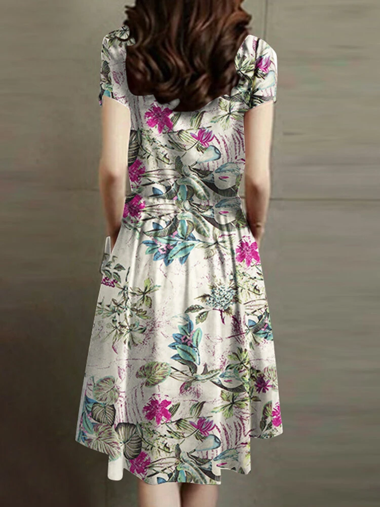 Flower Print Pocket Drawstring Waist Short Sleeve Midi Dress