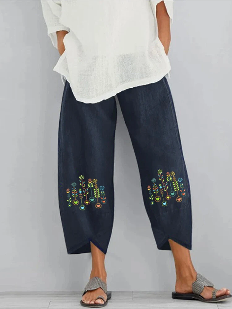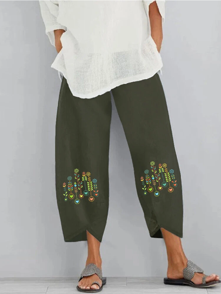 Flowers Print Elastic Waist Irregular Plus Size Pants