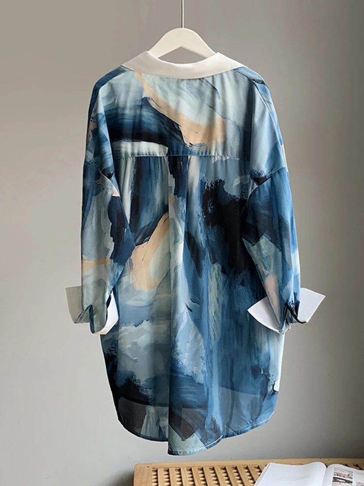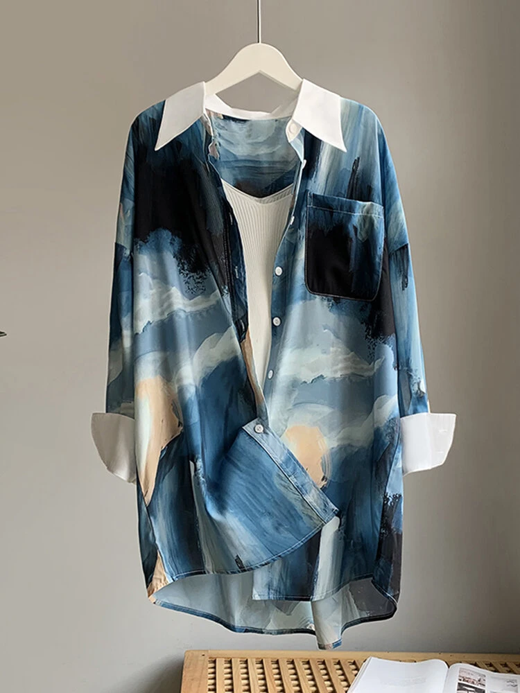 Ink Print Long Sleeve Pocket Button Front Lapel Shirt