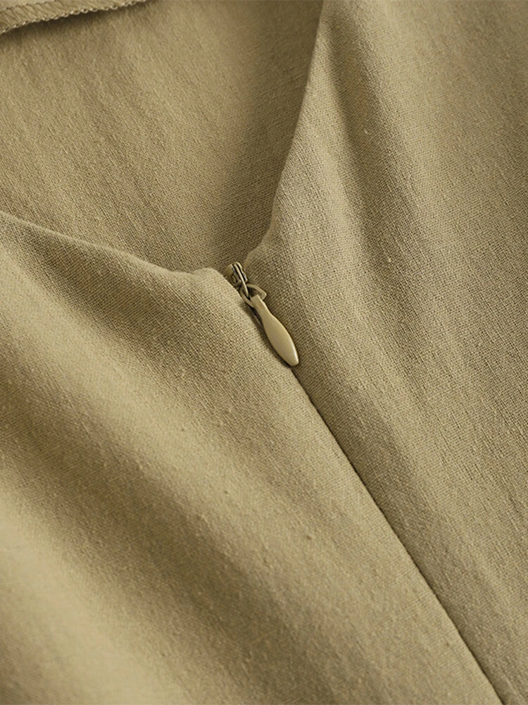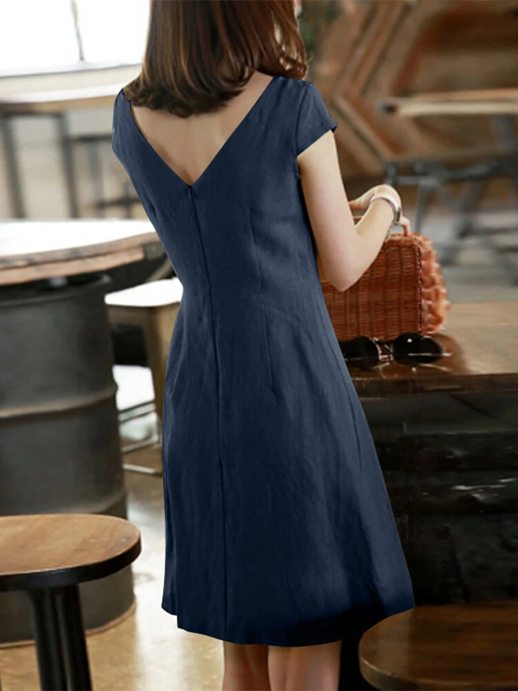 Color: Navy, Khaki, Orange, Army Green Style: Elegant Occasion: Office chic Material: Linen, Cotton Pattern: Plain Season: Summer Collar: Crew Neck Sleeves Length: Short Sleeve Length: Above Knee Package Included:1*Dress