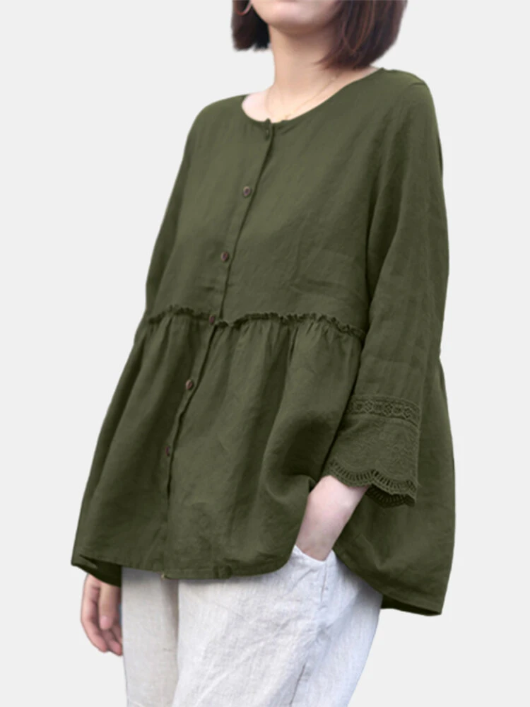 Lace Pleated Long Sleeve Plus Size Loose Blouse