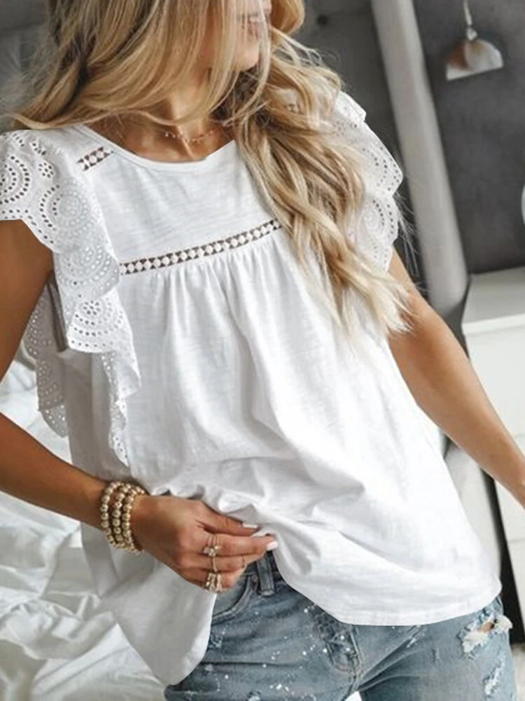 Lace Ruffle Sleeve Solid Crew Neck Loose Blouse