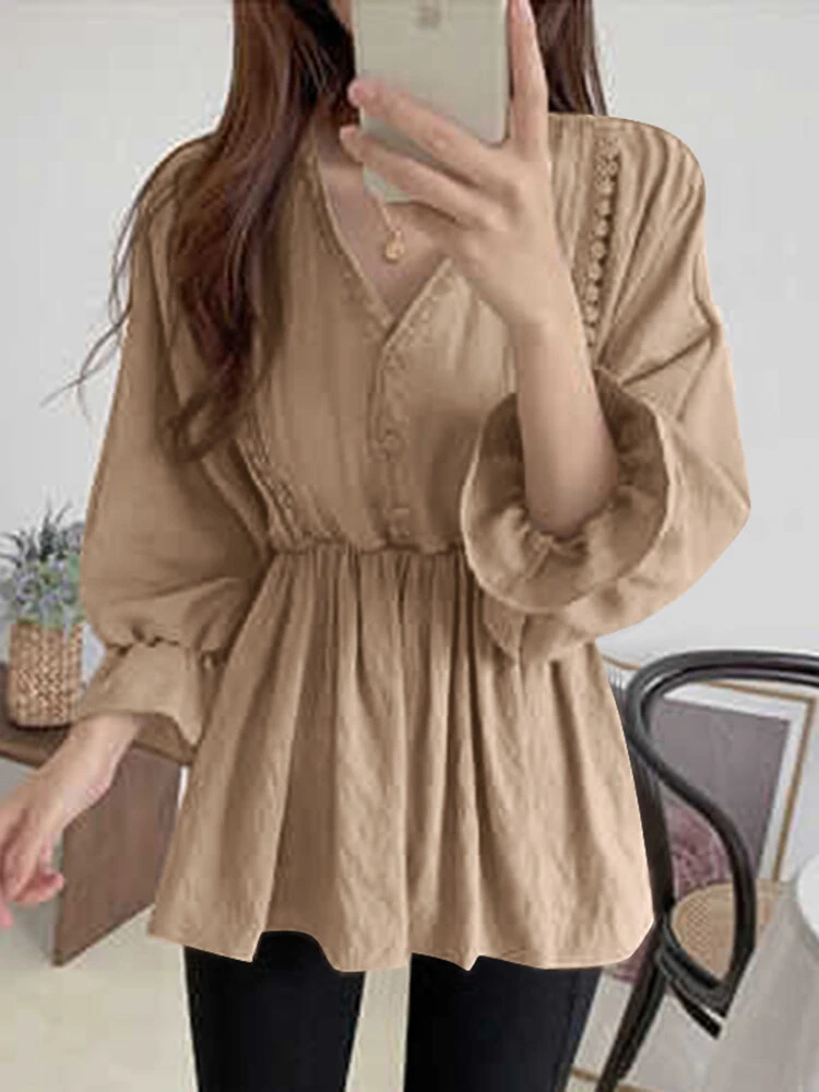 Color: Khaki, Apricot, Black Material: Polyester Style: Casual Sleeves Type: Puff Sleeves Collar: V-neck Season: Autumn, Spring Package Included:1*Blouse