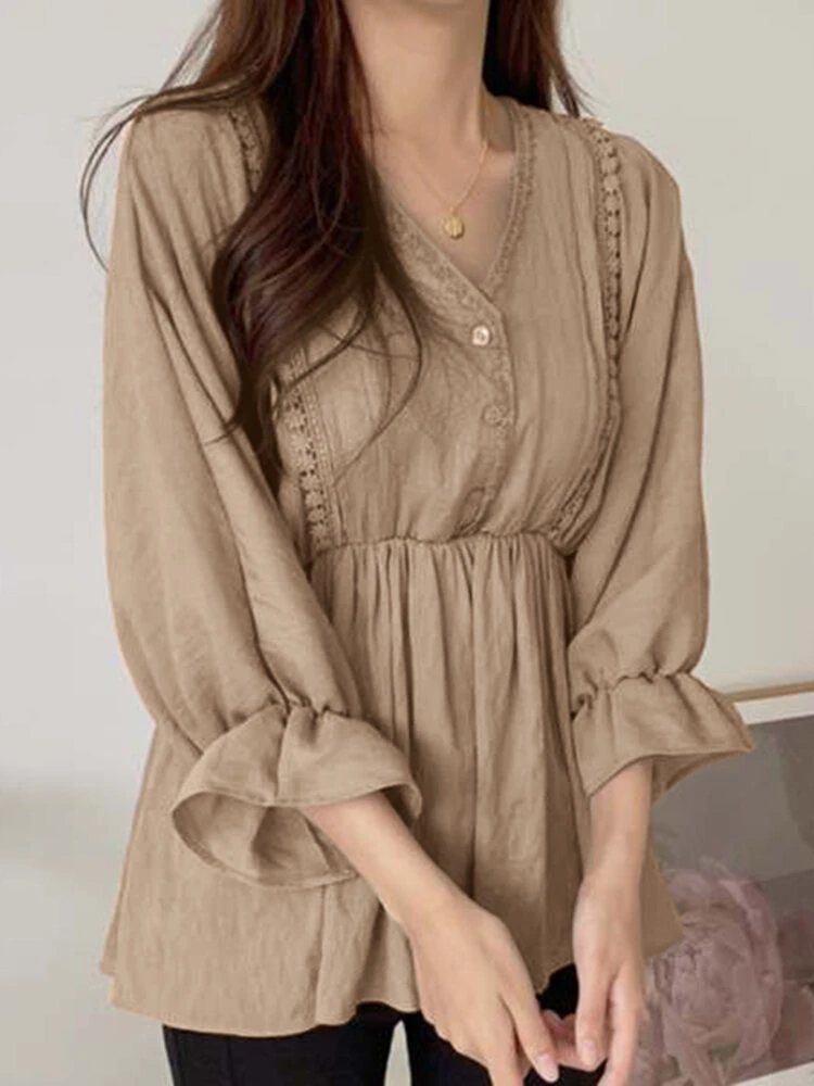 Be the first to review “Lace Trim Puff Sleeve Ruffle V-neck Solid Blouse” Cancel reply