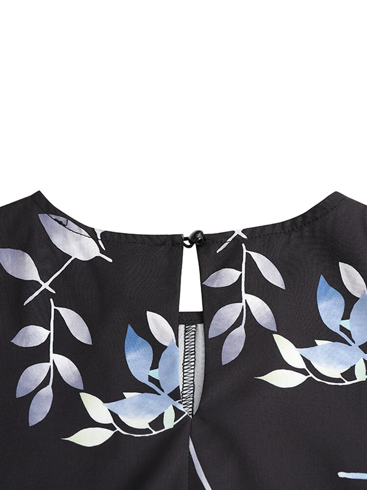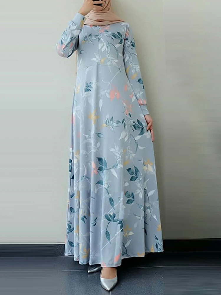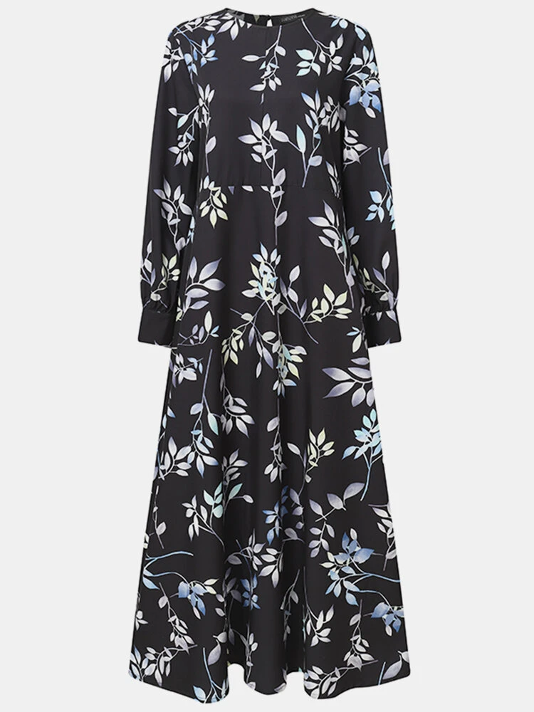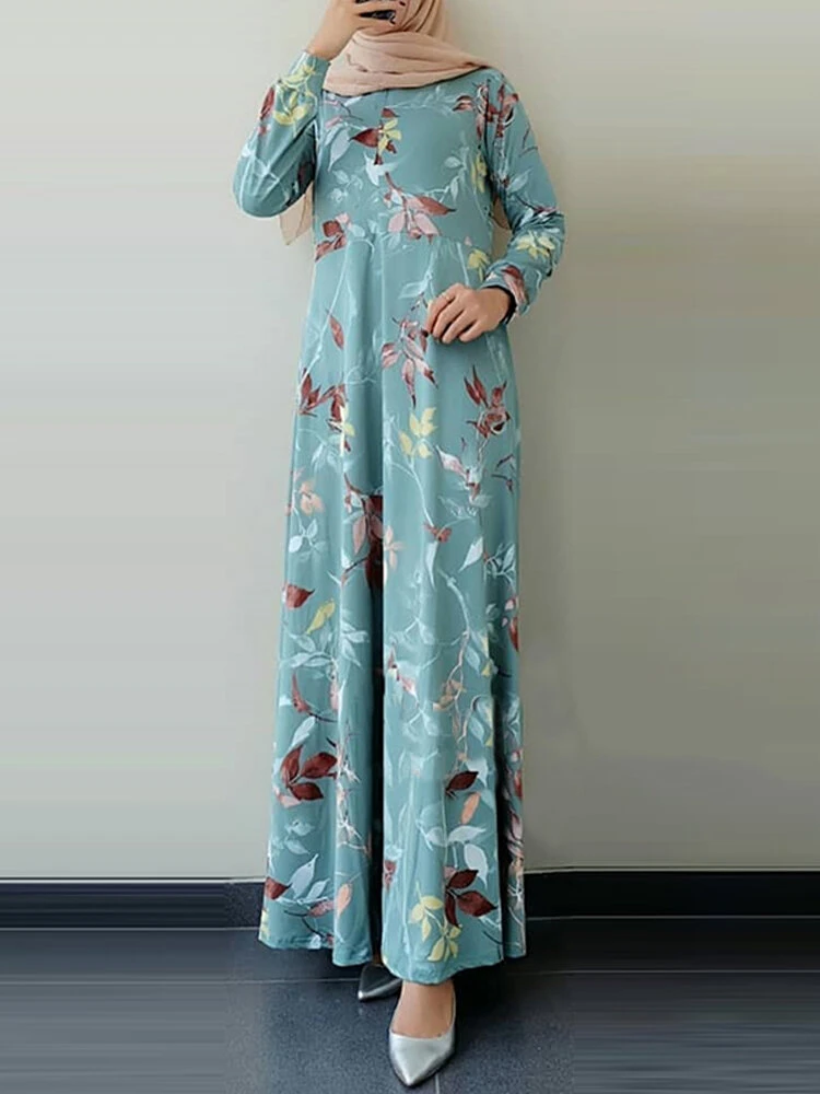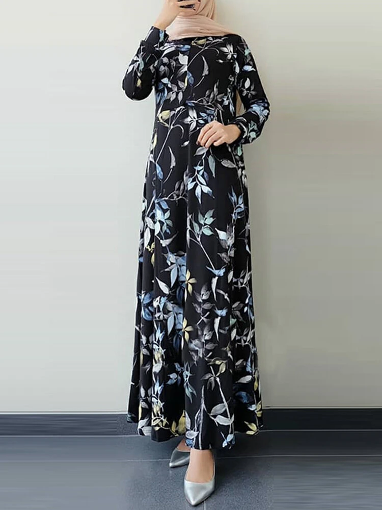 Leaves Print O-neck Long Sleeve Casual Muslim Dress For Women