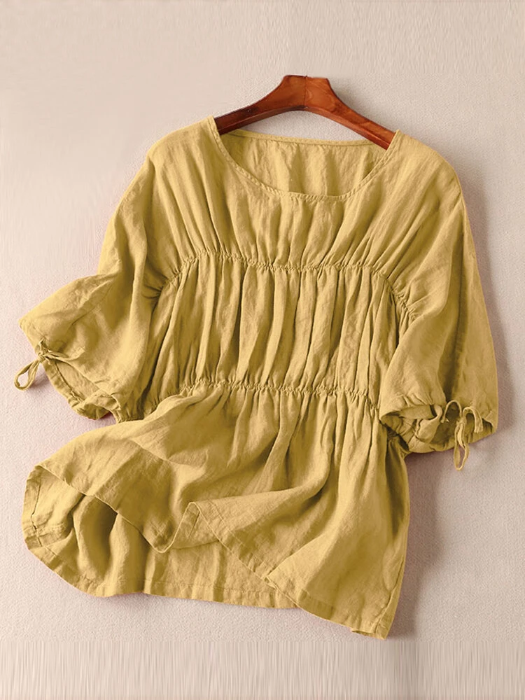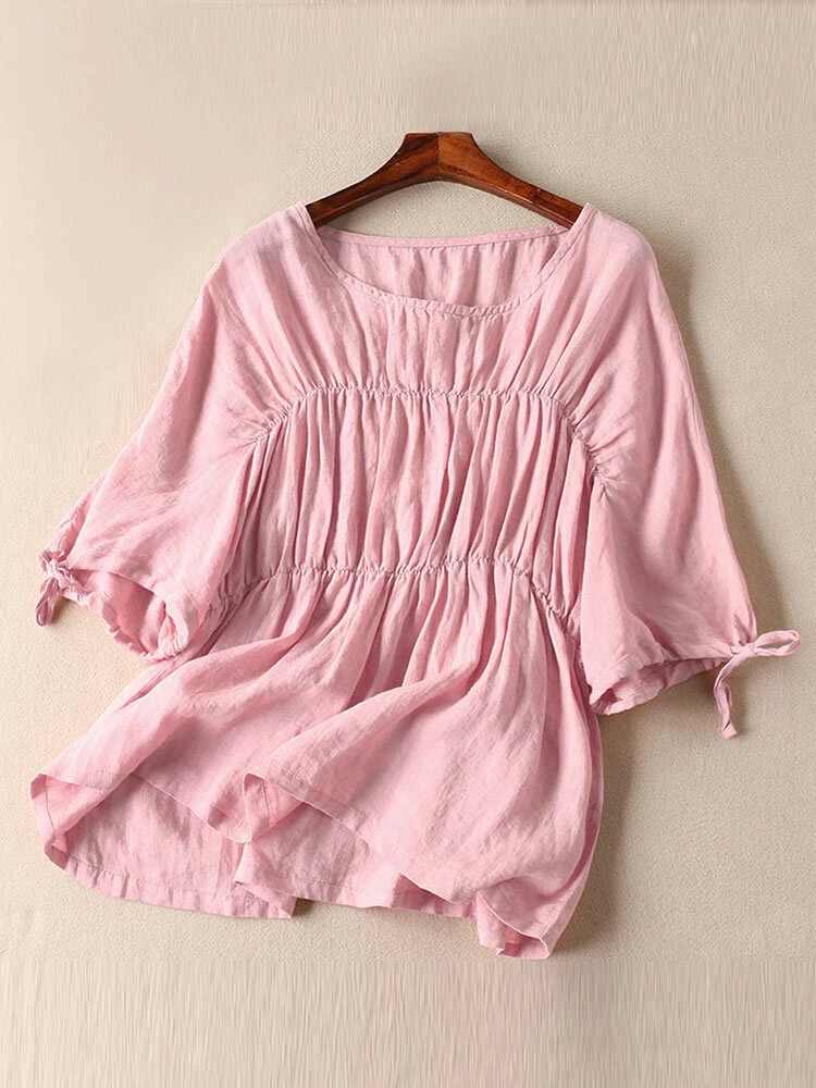 Be the first to review “Leisure Solid Tie-Up At Cuff Ruched Round Neck Cotton Blouse” Cancel reply