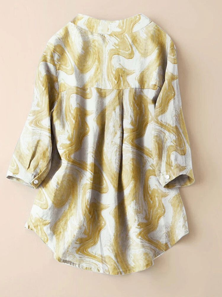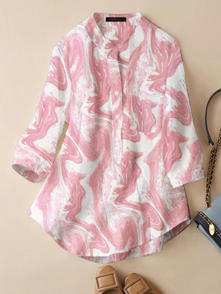 Marble Pattern Button 3/4 Sleeve Stand Collar Casual Blouse