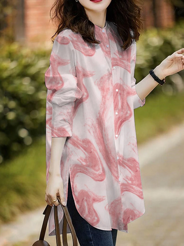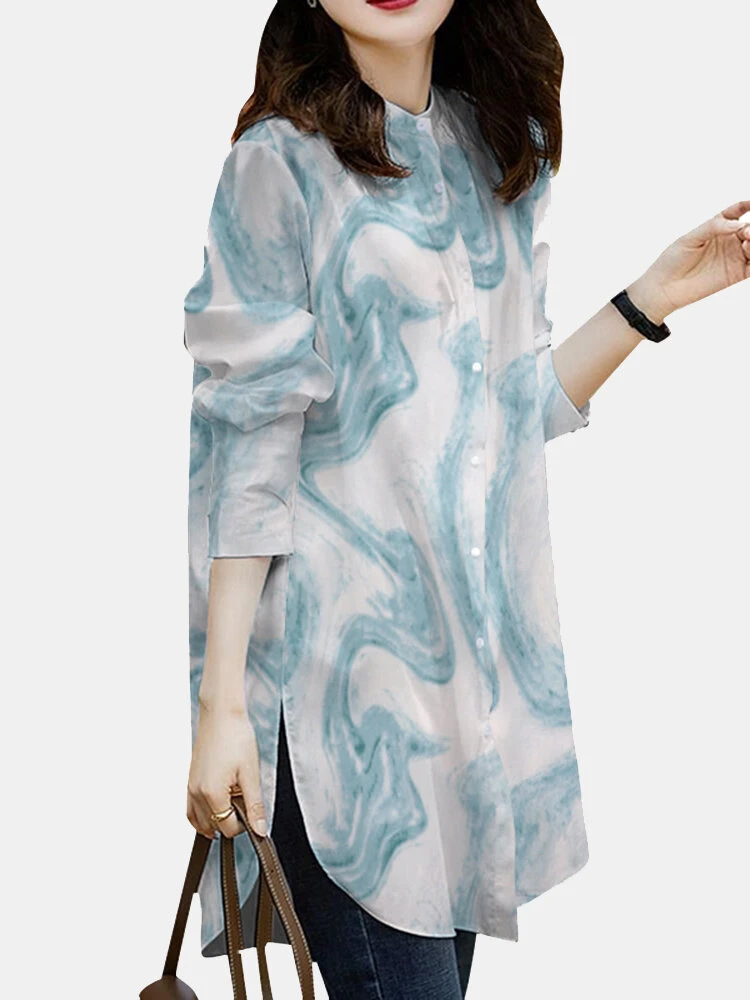 Color: Brown, Pink, Blue, Yellow Material: Polyester Pattern: Marble Occasion: Everyday Style: Casual Sleeves Length: Long Sleeve Collar: Stand Collar Fit Type: Loose Season: Autumn, Spring Design Element: Button Front Hem Design: Slit Hem Package Included:1*Blouse