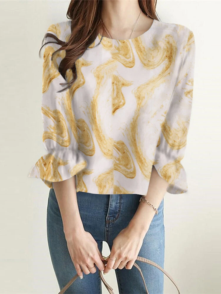 Color: Pink, Blue, Yellow Material: Polyester Pattern: Marble Occasion: Everyday Style: Casual Sleeves Length: 3/4 Length Sleeve Collar: Crew Neck Season: Autumn, Spring Package Included:1*Blouse