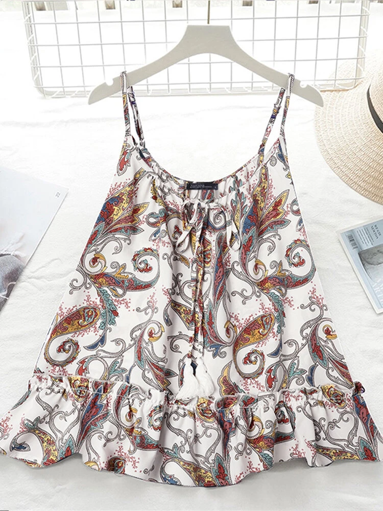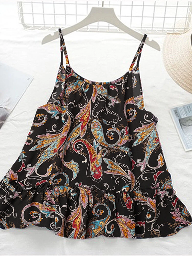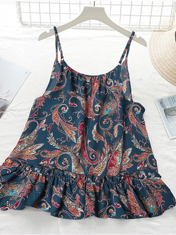 Color: Green, Blue, White, Black Material: Polyester Pattern: Paisley Print Occasion: Vacation Style: Boho Sleeves Length: Sleeveless Collar: Spaghetti Strap Season: Summer Package Included:1*Cami