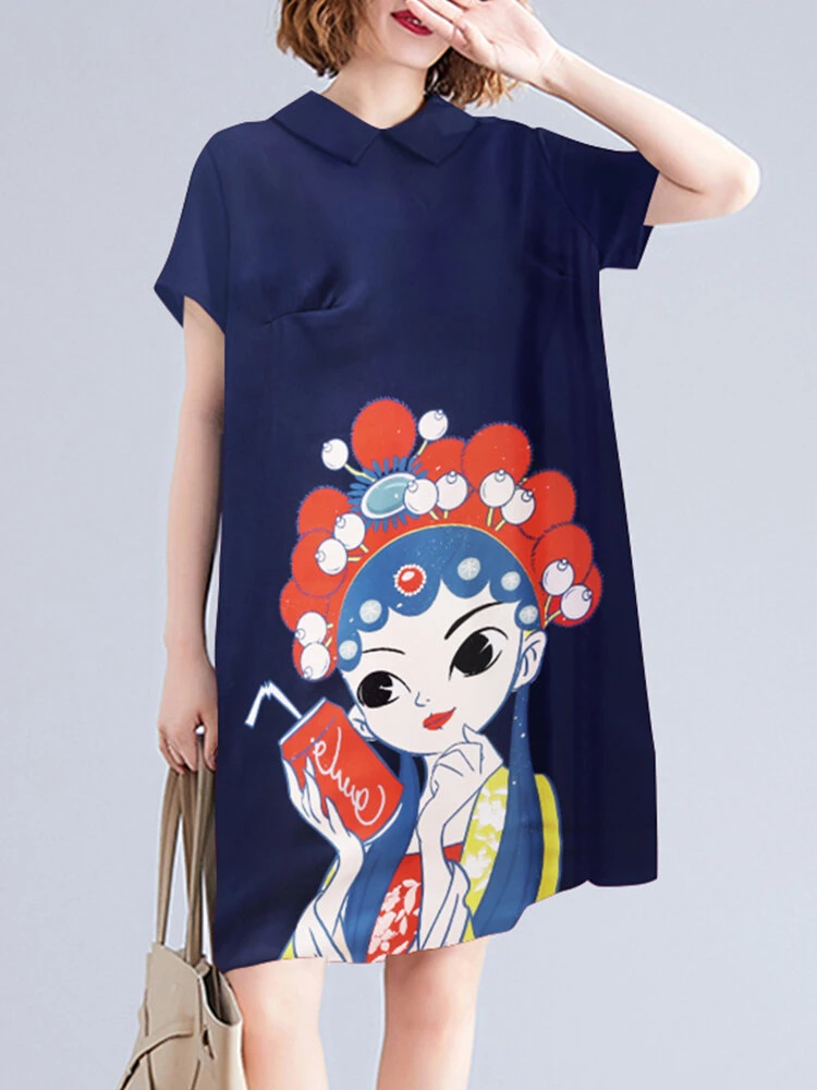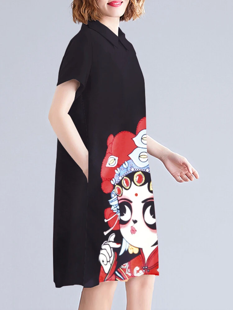Peking Opera Pattern Pocket Short Sleeve Midi Dress