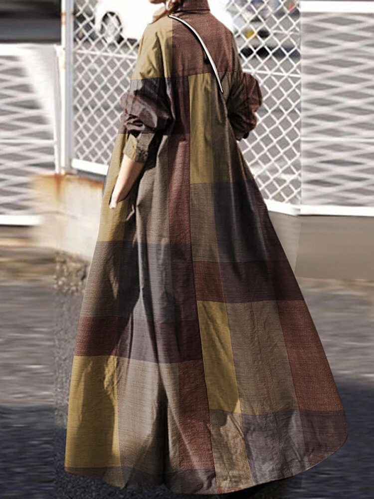 Plaid Print Lapel Long Sleeve Button Plus Size Maxi Dress With Pockets