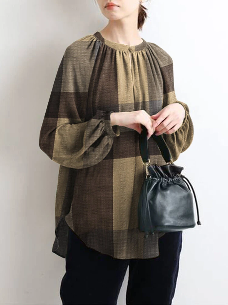 Plaid Print O-neck Button Slit Hem Vintage Loose Blouse