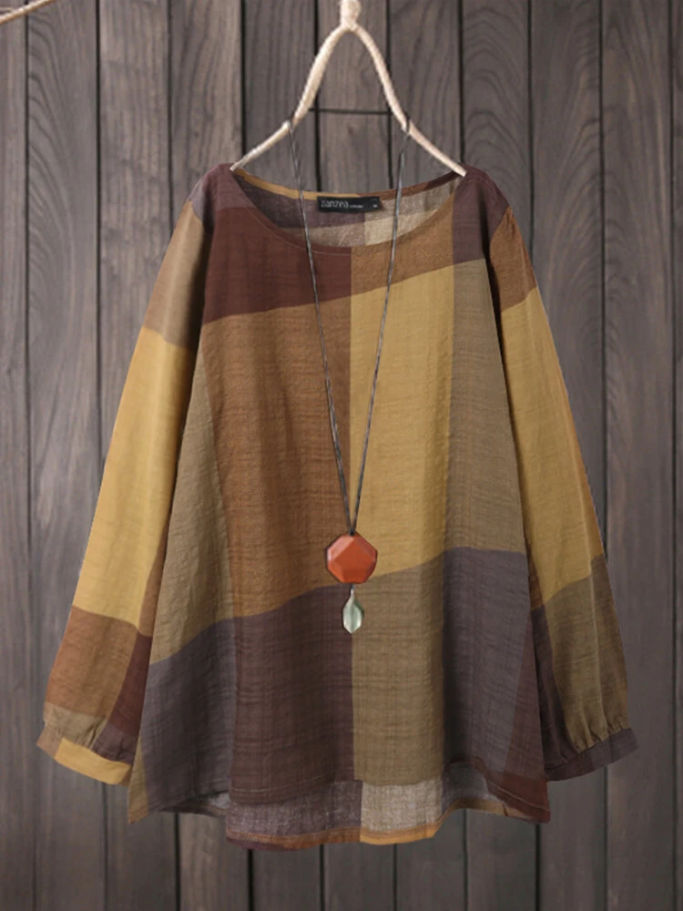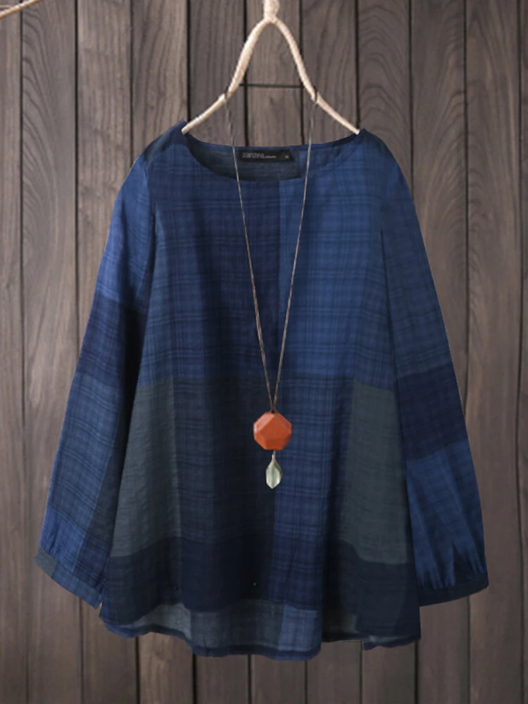 Plaid Print O-neck Long Sleeve Asymmetrical Blouse For Women
